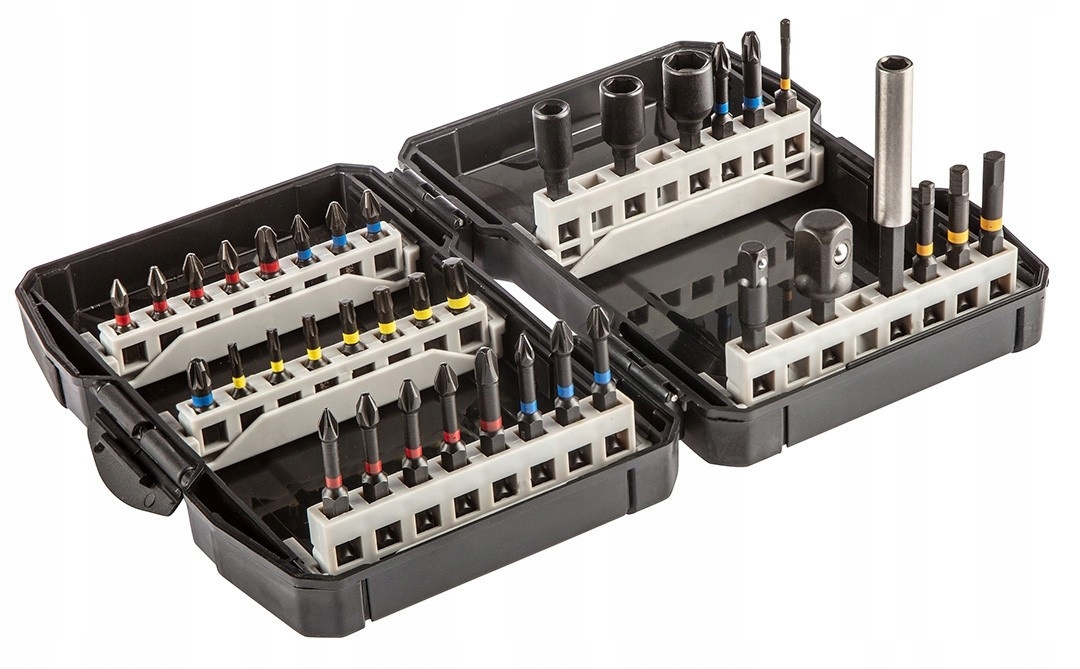 Набір ударних біт GRAPHITE (арт. № 56H560) містить 36 елементів, включаючи 16 біт PH1/2/2/2/3, PZ1/2/2/3, T10/15 / 20/25/27/30/40 загальною довжиною 25 мм, 14 наконечників типу PH1/2/2/2/3, PZ1/2/2/2/3, HEX3/4/5/6 з загальна довжина 50 мм і ручка, три розетки і два перехідника. Це міцні біти, призначені для важкої роботи з високим крутним моментом за допомогою викруток або ударних шуруповертів. Виготовлений з високоякісної сталі S2, яка характеризується підвищеною гнучкістю і стійкістю до механічних пошкоджень. Зона кручення, що обертається під дією великого крутного моменту, зменшує передачу зусилля, роблячи насадку більш стійкою до поломки, а термін її служби збільшується в кілька разів. Робочий кінчик наконечника гарантує ідеальну посадку. Все це поміщено в закриту пластикову коробку з прогумованими краями. Торгова марка GRAPHITE пропонує широкий вибір електроінструментів, які відповідають вимогам професіоналів.