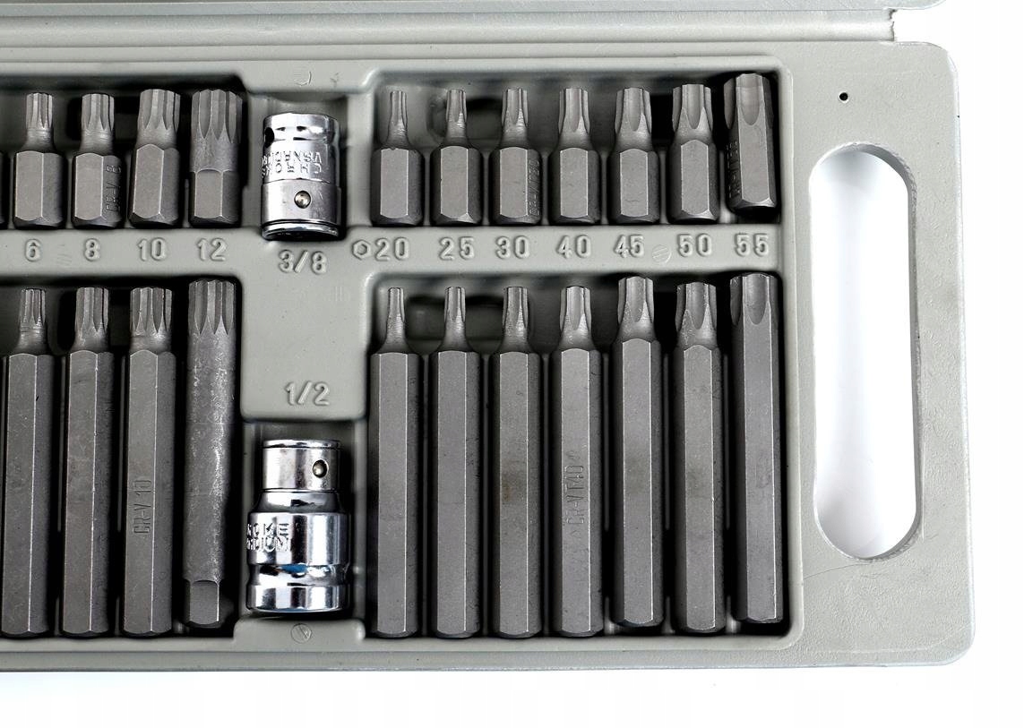 Різноманітність біт забезпечує можливість виконання багатьох робіт у спеціалізованих механічних і автомобільних службах. Наконечники мають дві довжини: 30 і 75 мм, встановлені в шестигранний тримач 10 мм, адаптований для роботи з тріскачкою 1/2" і 3/8".