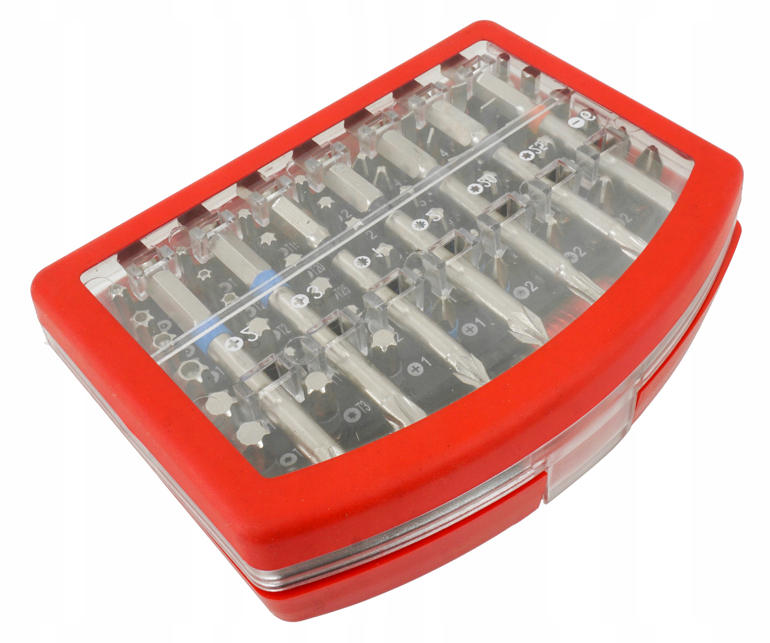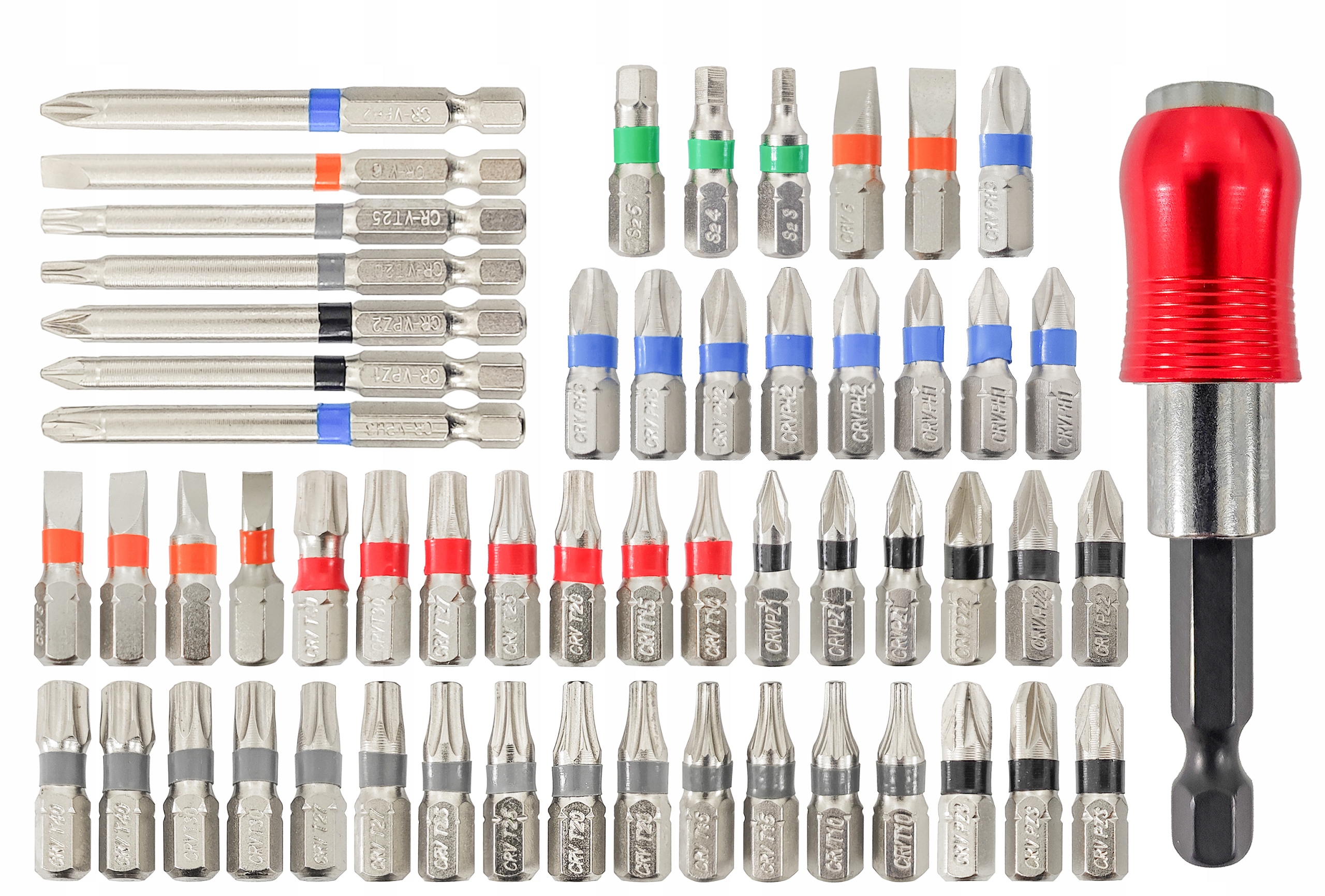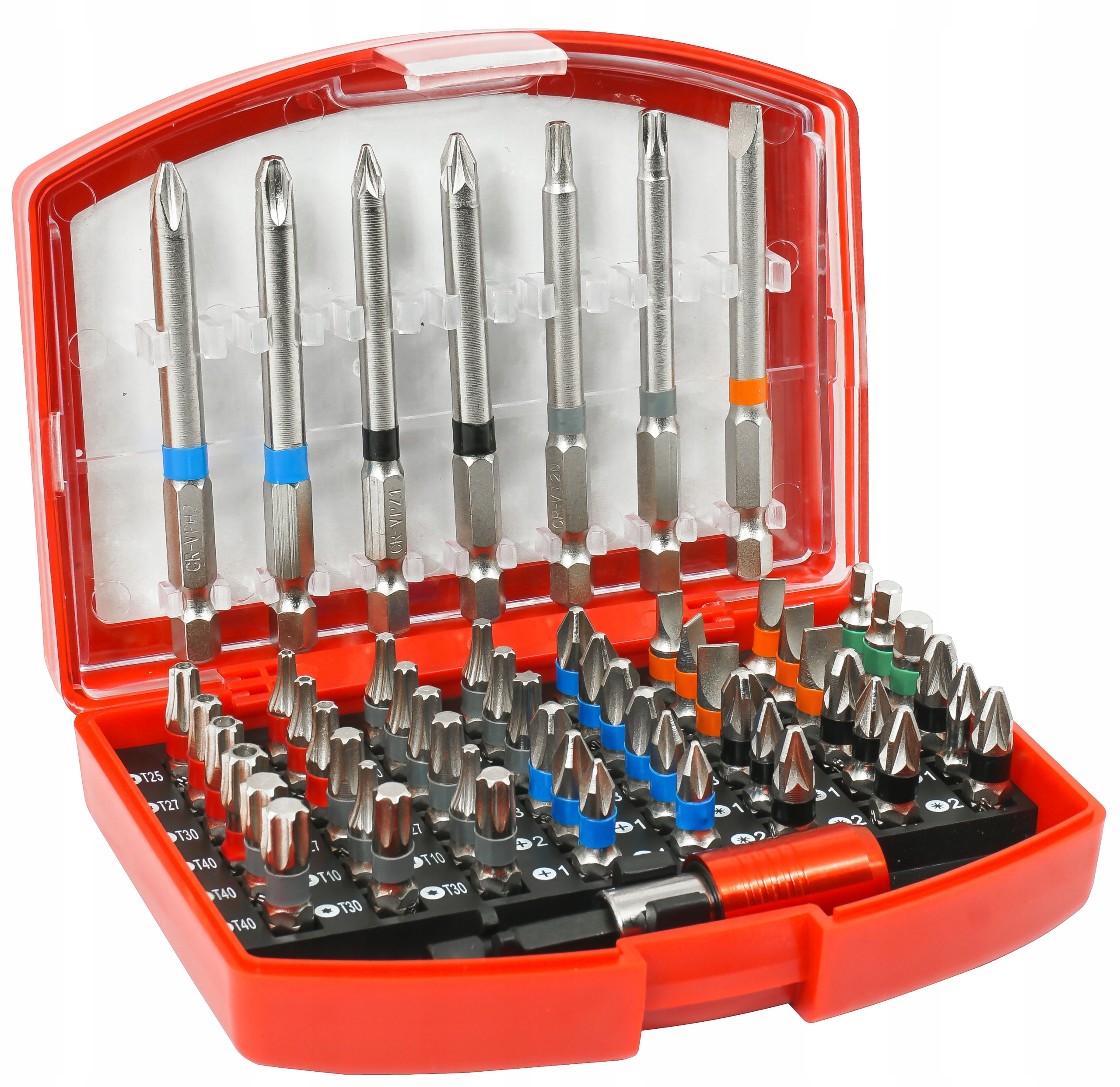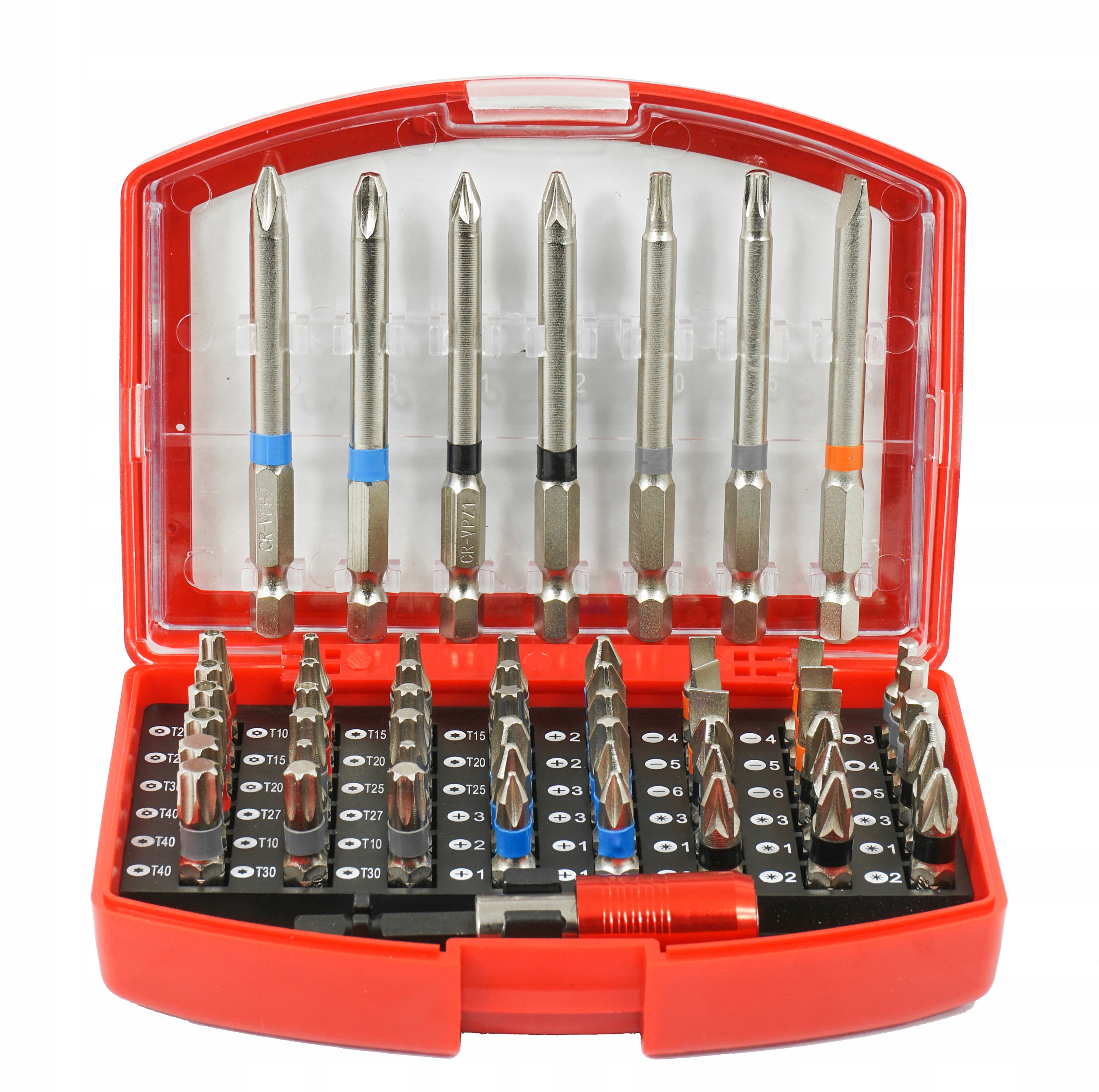 Магнітний тримач біт із рухомим коміром, що полегшує витяг біт Перехідник із шестикутника 1/4 дюйма на квадрат 1/4 дюйма, що дозволяє кріпити гнізда 1/4 дюйма Біти додатково мають ручки, пофарбовані в різні кольори для легкої ідентифікації Біти упаковані в зручну пластикову коробку з можливістю кріплення на пояс.