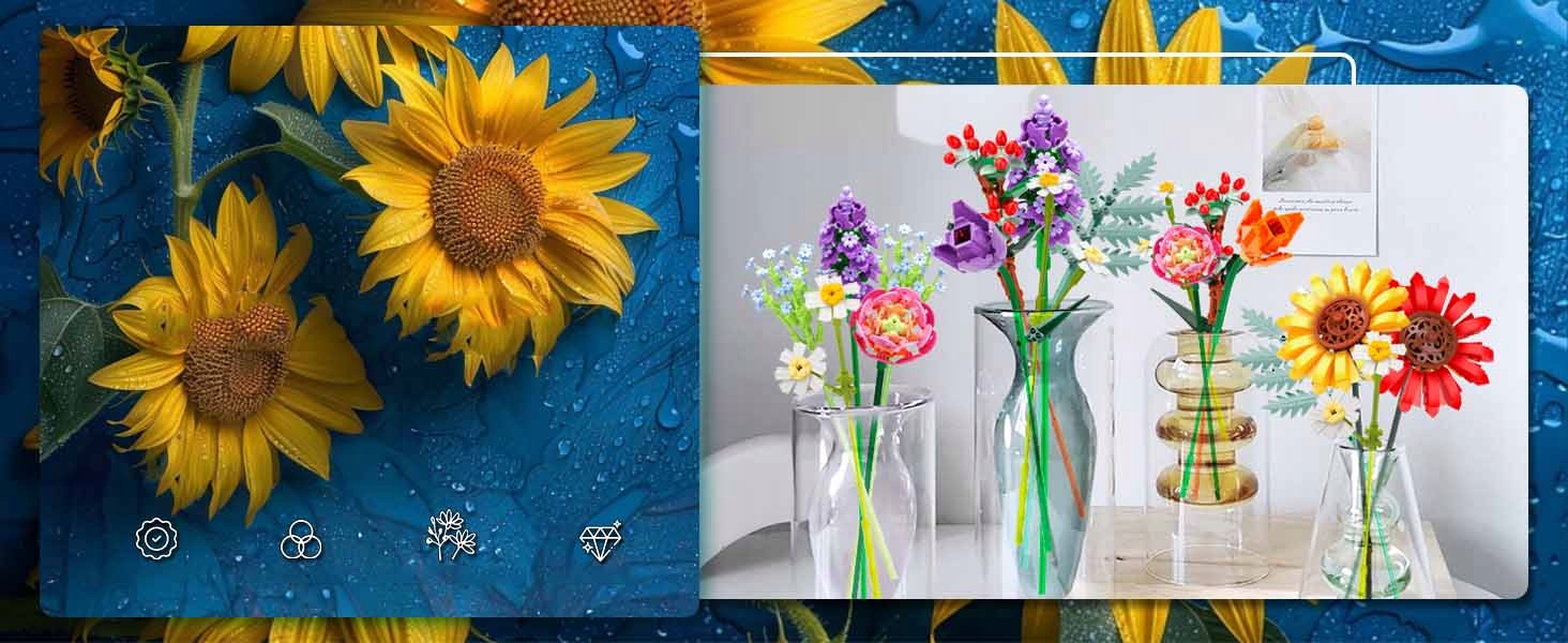 💐psp 976 Елементи для побудови приголомшливого букета - складається з 17 різних квітів, включаючи соняшники, тюльпани, Лізіантус, ромашку, лаванду, зсув та гіпс. Букет може бути створений дітьми з 14 років та дорослими, це захоплена і красива репліка реальних рослин та квітів.