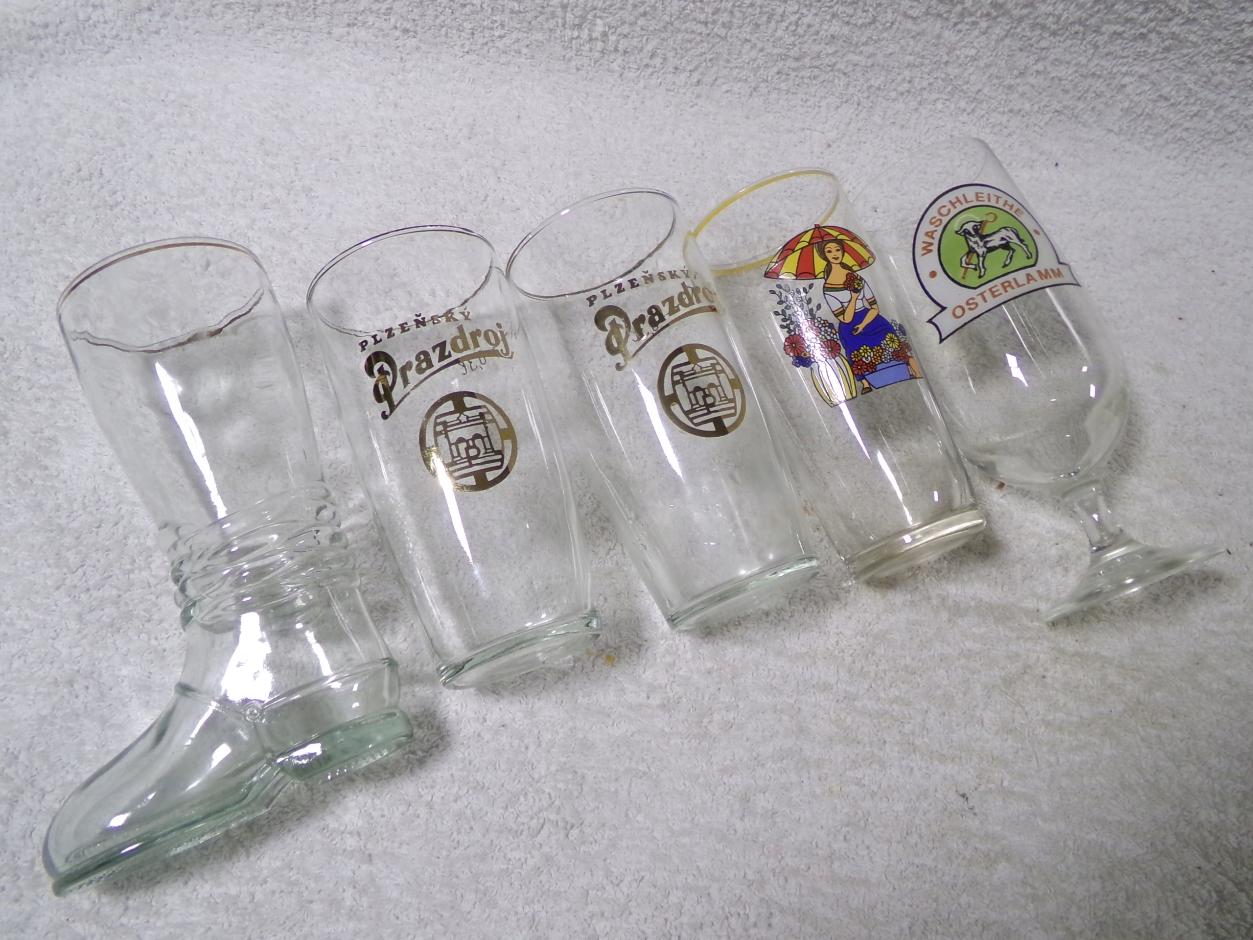 Набір пивних келихів висотою від 13,5 до 17 см, внутрішнім діаметром від 5,5 до 6,5 см, місткістю від 200 до 300 мл, вагою 0,87 кг. Дуже хороший стан, без пошкоджень.