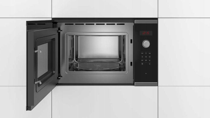 Вбудована мікрохвильова піч Bosch BFL553MS0, 59 x 38 см, з макс. потужністю 900 Вт, чорного кольору, виготовлений з нержавіючої сталі, що дозволяє розморожувати, розігрівати та швидше готувати їжу.