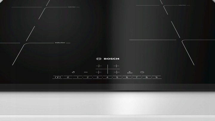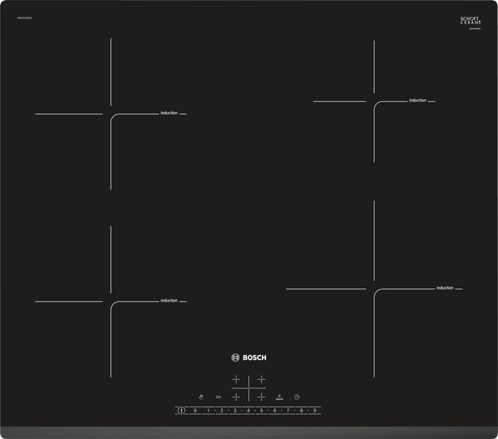 Індукційна плита Bosch PIE 631FB1E , шириною 59,2 см, з 4 зонами нагріву, таймером з функцією відключення для кожної зони, 17 рівнями потужності, 2-ступеневим індикатором залишкового тепла, блокуванням від дітей та захисним вимикачем.