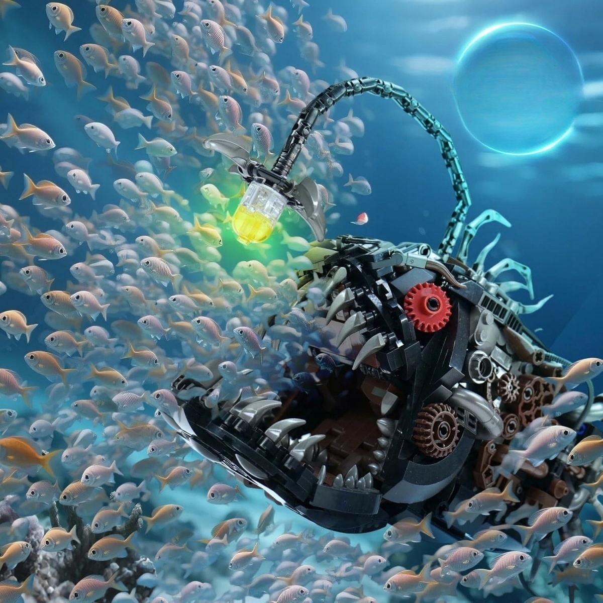 🐠 Набір для будівництва рибок: містить 1038 блоків для створення моделі ліхтаря-рибалки на природі. Створіть відтворення, яке точно повторює справжнього морського мешканця, таким чином поглибивши своє розуміння форми й анатомії риби-ліхтаря.