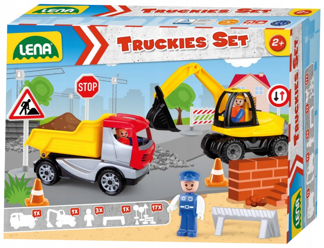 будівельний майданчик Lena Truckies. Він складається з екскаватора Triveper та Truckies, набору знаків Lena Road з 17 частинами та наклейками, статуетками поліцейського Лени та дорожньої блокади. Це дозволяє творчі ролі. Підходить для дітей від 2 років. Підходить для використання всередині та зовні. Зроблено в Європі. Сертифікат Tüv