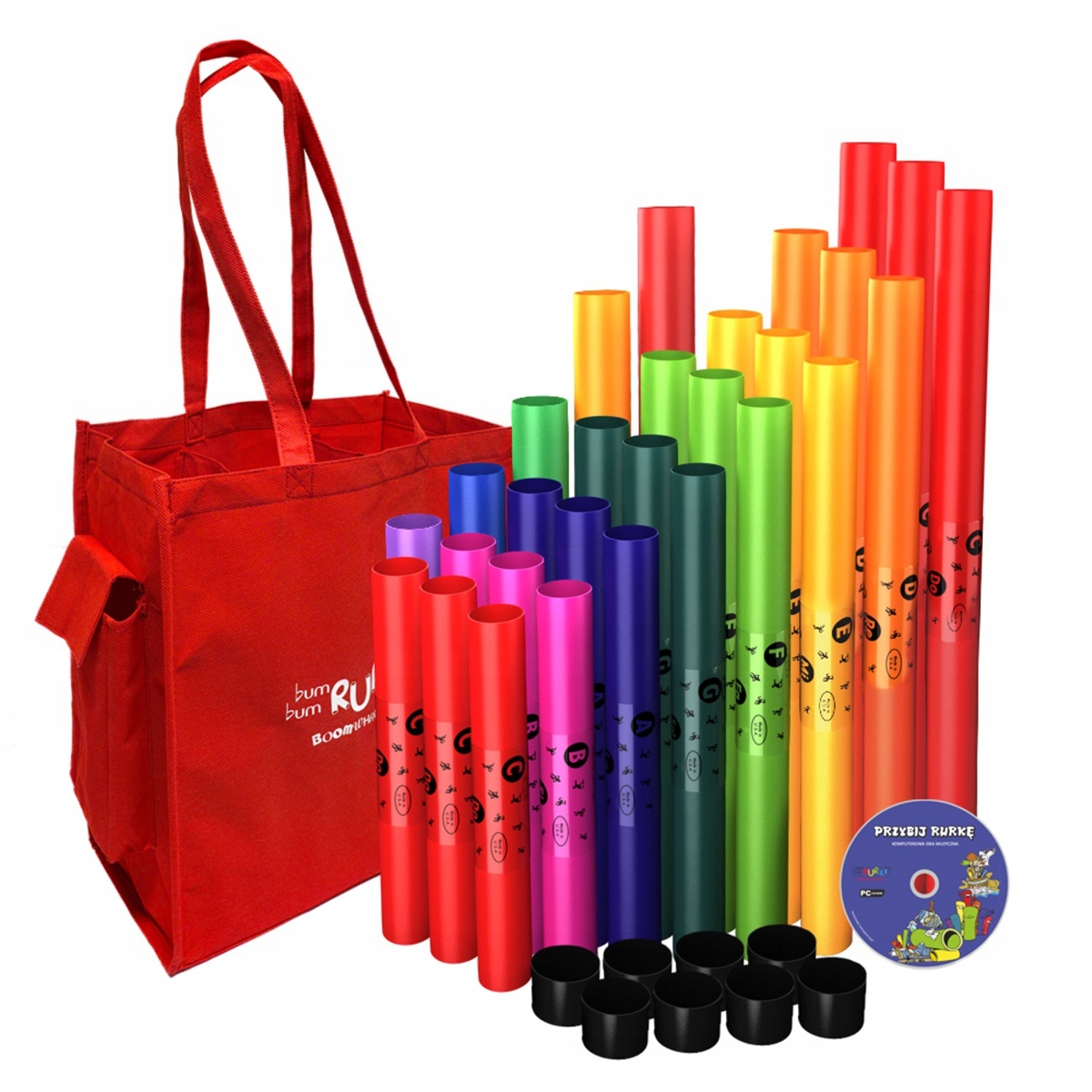 Червона тканинна сумка має шість внутрішніх відділень, які вміщують 28 Bum Bum Rurek®, дві зовнішні кишені, що закриваються на липучку (де можна сховати, наприклад, октаватори), і плоска кишеня ззаду (наприклад, для нот або пісенників).