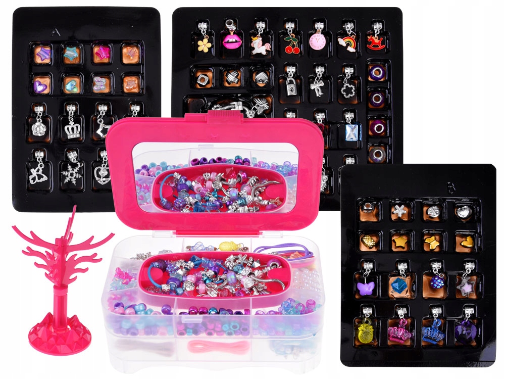 У набір входить прозорий пластиковий футляр з відділеннями і дзеркалом, в якому можна зберігати невикористані аксесуари для виготовлення прикрас і готові прикраси. Завдяки ручці чохол можна легко перенести в інше місце. Чохол складається з двох елементів. Щоб розгорнути кейс, відкривши кришку, поверніть два рожеві захисні пристрої всередині коробки.