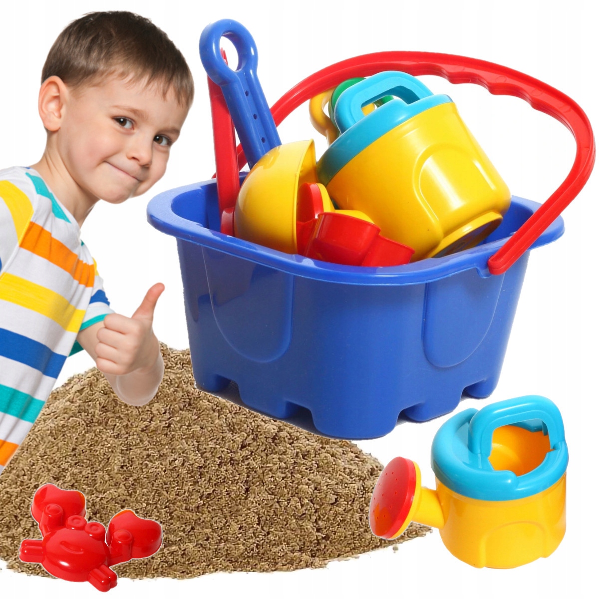 барвистий набір іграшок з піском та пісочниці буде працювати на задоволення на кожному морському пляжі та у воді. Іграшка також дозволяє розвивати почуття дитини та когнітивні здібності.