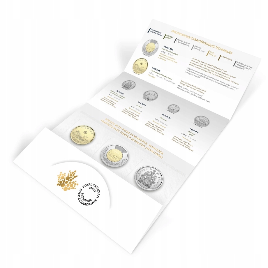 На реверсі зображено відповідно: бобра (5 центів), вітрильник (10 центів), оленя (25 центів), герб Канади (50 центів), качка (1 долар) і білий ведмідь (2 долари). На реверсі також міститься інформація про номінал, країну-емітент – Канаду – та рік випуску 2026.