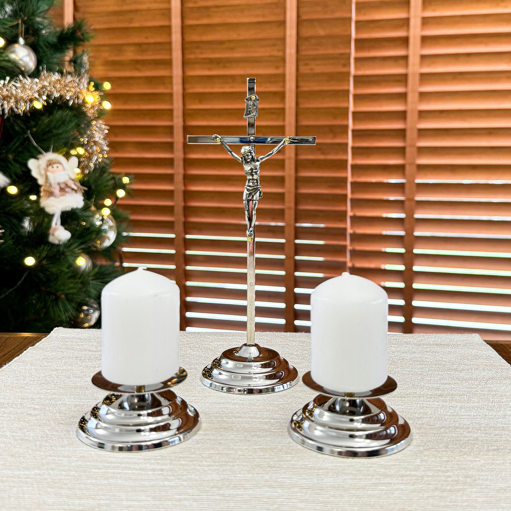 Колядник зроблено в ПОЛЬЩІ з особливою увагою до кожної деталі. Хрестовина виготовлена з хромованого латунного стрижня та нержавіючої сталі. Образ Господа Ісуса був виготовлений із цинкового сплаву, покритого гальванічним покриттям для захисту від корозії. Свічники виготовлені з нержавіючої сталі, а весь набір захищений лаками найвищої якості. Завдяки цьому ми впевнені, що він прослужить нам багато років.