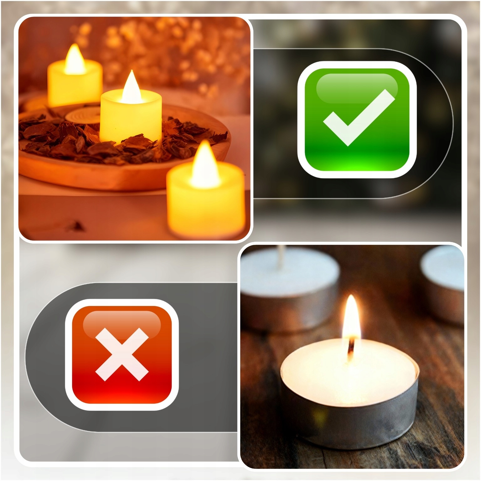 Їхні компактні розміри, елегантний зовнішній вигляд і відсутність ризику опіків дозволяють безпечно використовувати їх у свічниках, ліхтарях і прикрасах.