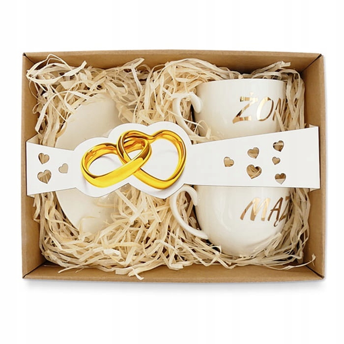 Набір красивих порцелянових чашок благородного білого відтінку з золотим написом - варіант для молодят. Упакований в картонну коробку, наповнену рафією. До чашок додаються класичні блюдця. Набір чудово підійде як доповнення до подарунка та сподобається кожному, адже хто ж не любить пити каву?