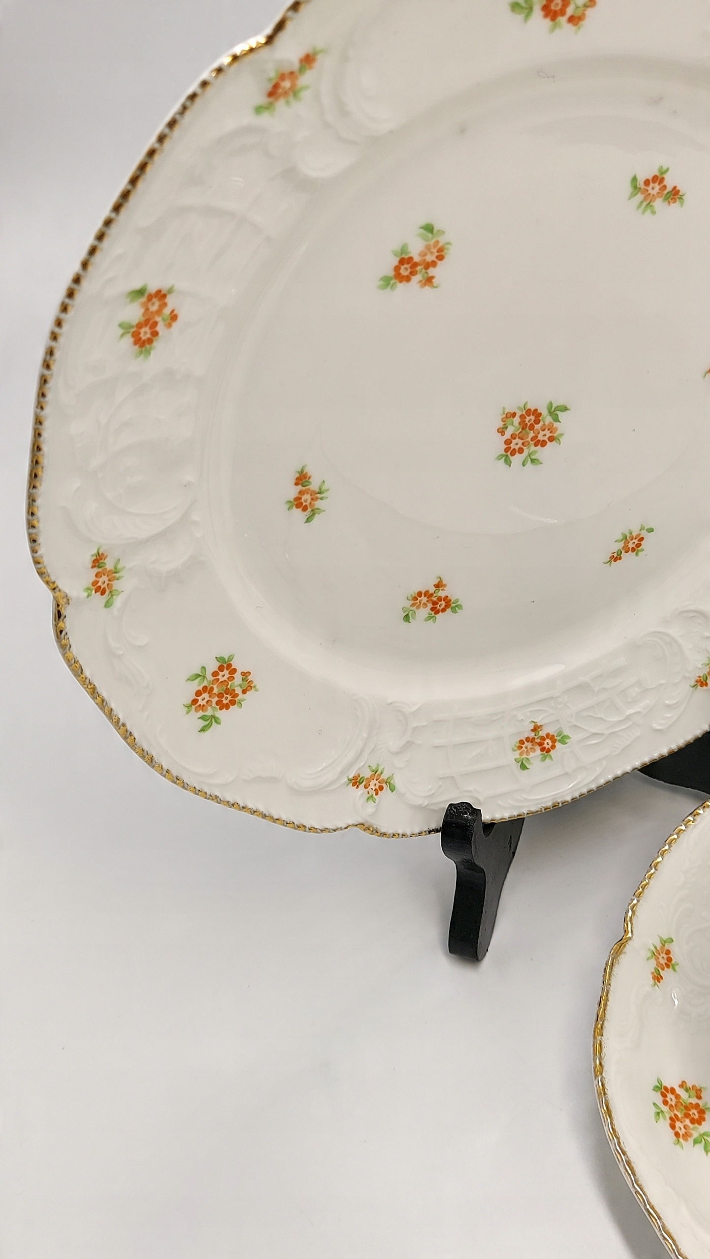Набір виготовлено з білої порцеляни найвищої якості, з рельєфним малюнком у стилі рококо, характерним для колекції Сан-Сусі. Додатково прикрашений золотими та маленькими помаранчевими квітами.