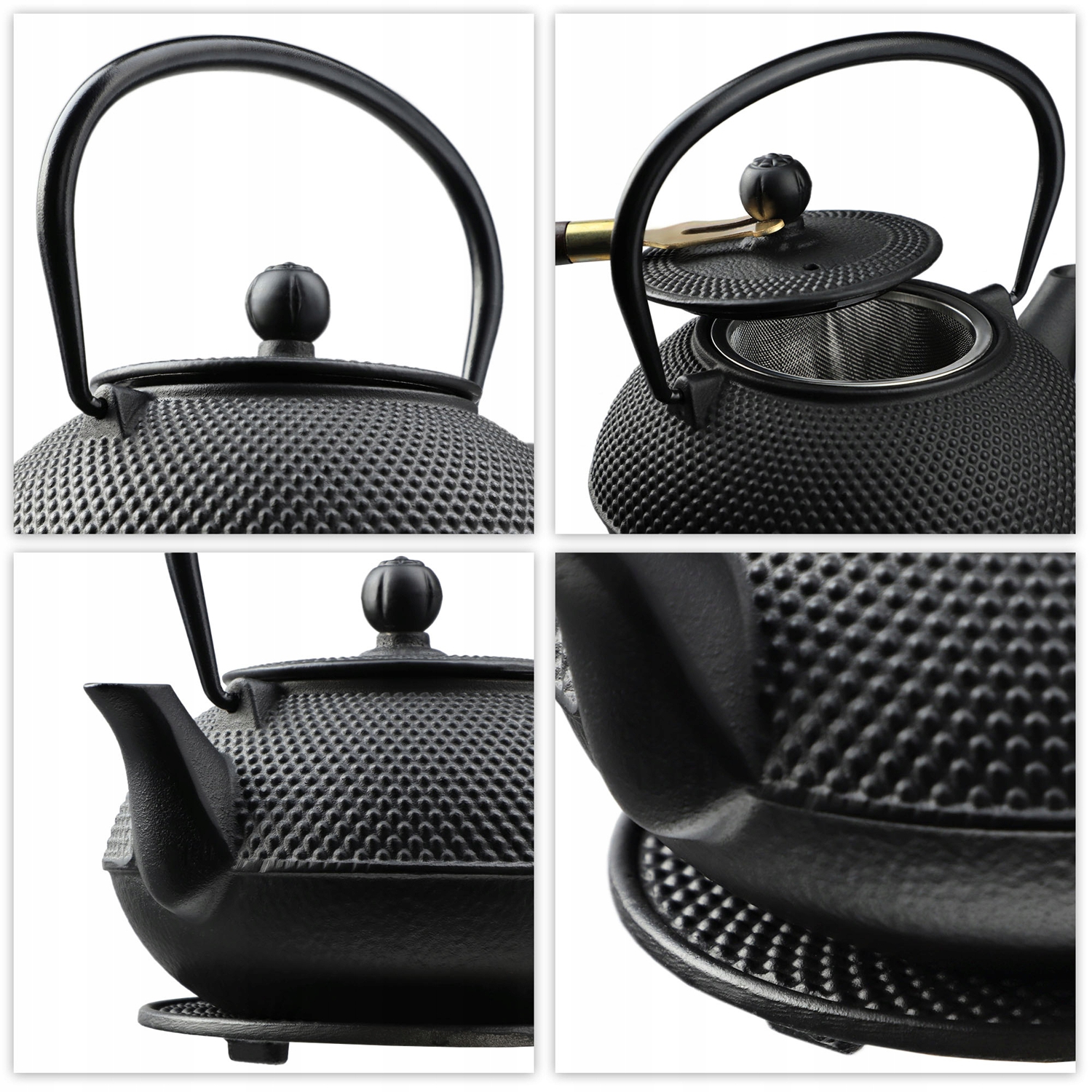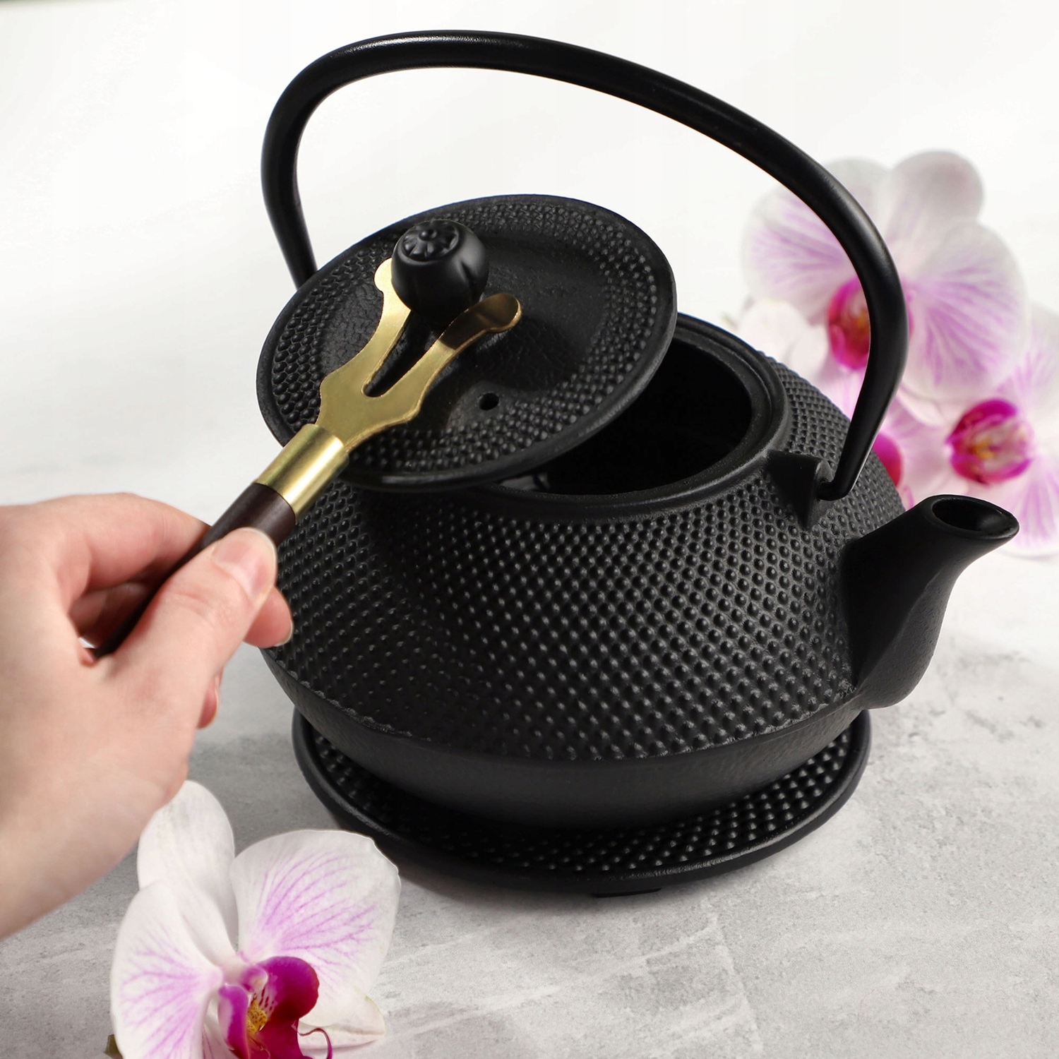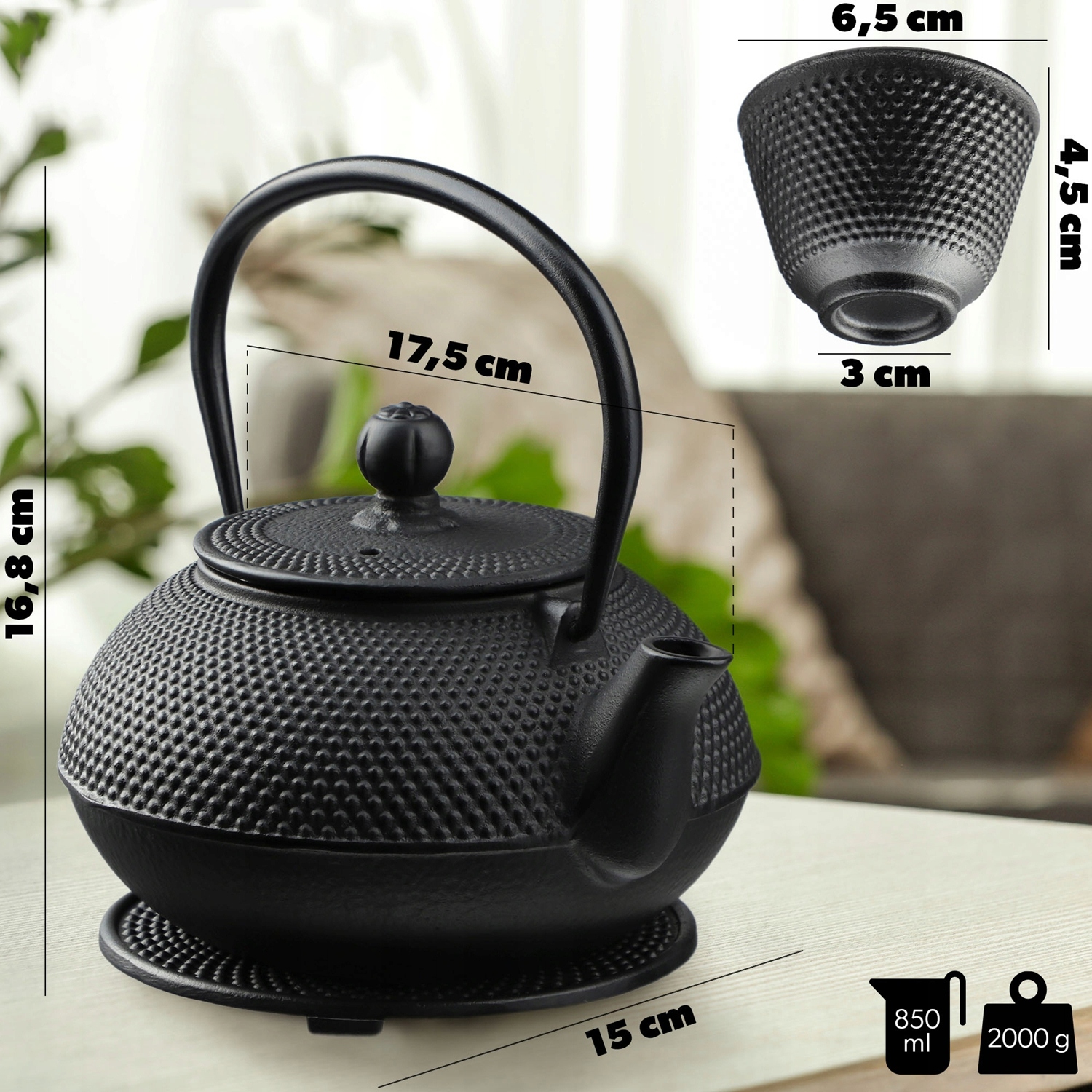 чавунний чайник з чашкою та основою. Чайник з чавуну був професійно виготовлений у східній естетиці, що символізує силу та красу. Завдяки позачасовому привабливому силуету, чайник ідеально відповідає будь -якому стилю інтер'єру. Це неминуче приверне увагу гостей, а також буде ідеальним як подарунок.