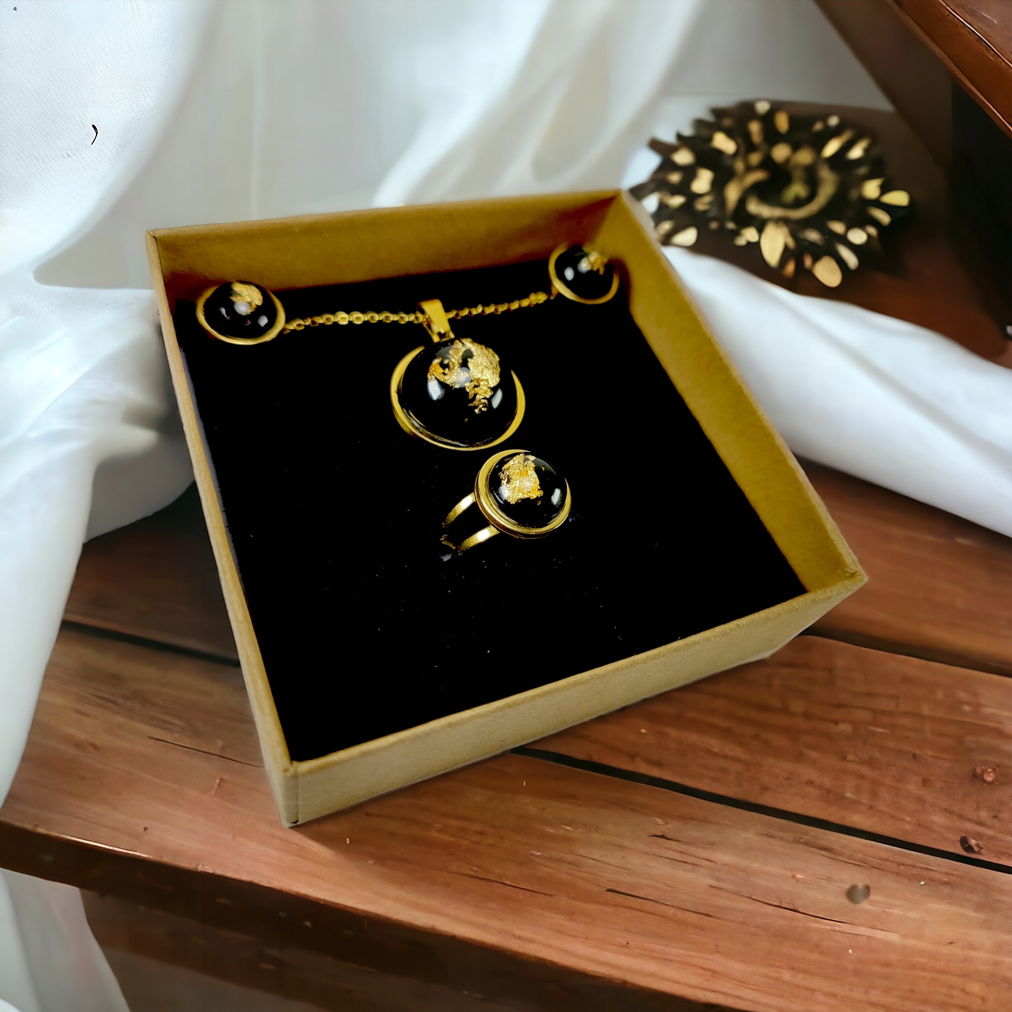 Оригінальний та унікальний набір ювелірних виробів, який, безумовно, приваблює зовнішній вигляд! Комплект включає елегантне намисто, стильні сережки та ефективне кільце - всі прикрашені золотими пелюстками, вбудованими в чорну смолу, які дають їм унікальний персонаж.