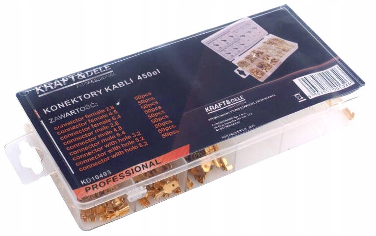 Чоловічі, жіночі та вушки польської марки Kraft & Dele з маркою KD10493, що постачається у зручній суцільній упаковці для легкої сегрегації для індивідуальних типів роз'ємів. Підказки для з'єднувачів використовуються для підключення кабелів з електричними пристроями, іншими кабелями тощо.