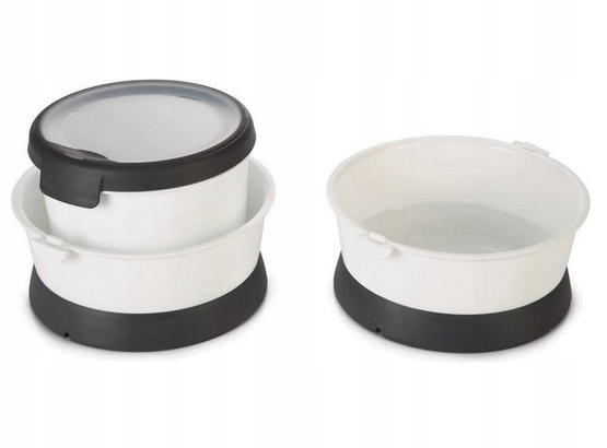Все це складається до компактних розмірів завдяки можливості ховати контейнер всередині з’єднаних чаш. У набір також входить ручка, роль якої, окрім полегшення перенесення, полягає у фіксації мисок у транспортному положенні.