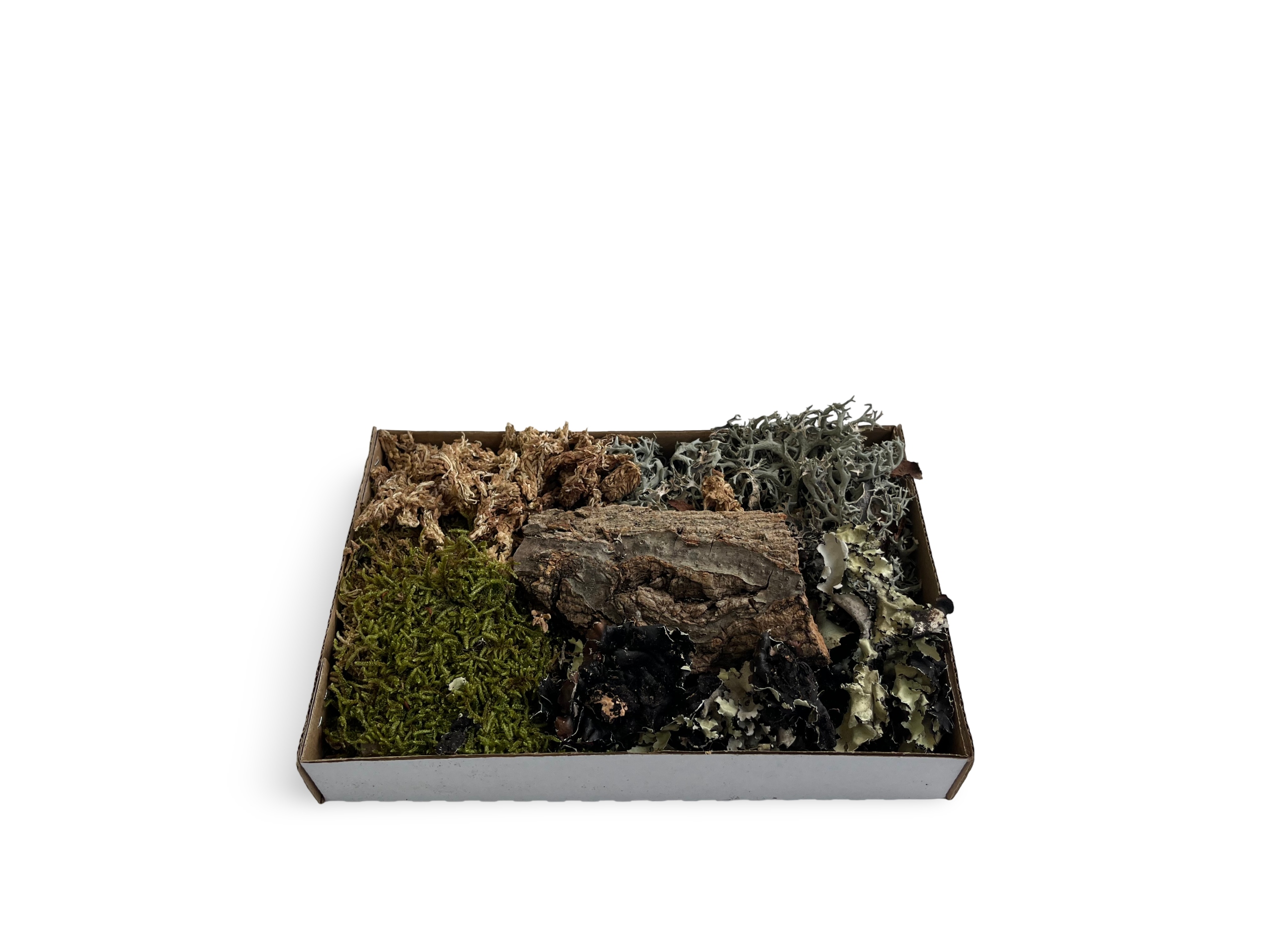 У набір входять: мох сфагнум, кореневий мох, патч-мох, мох хлоботек, іспанський мох, бразильський мох, лишайник, корінь шишки, схованки для сухофруктів і лотос.