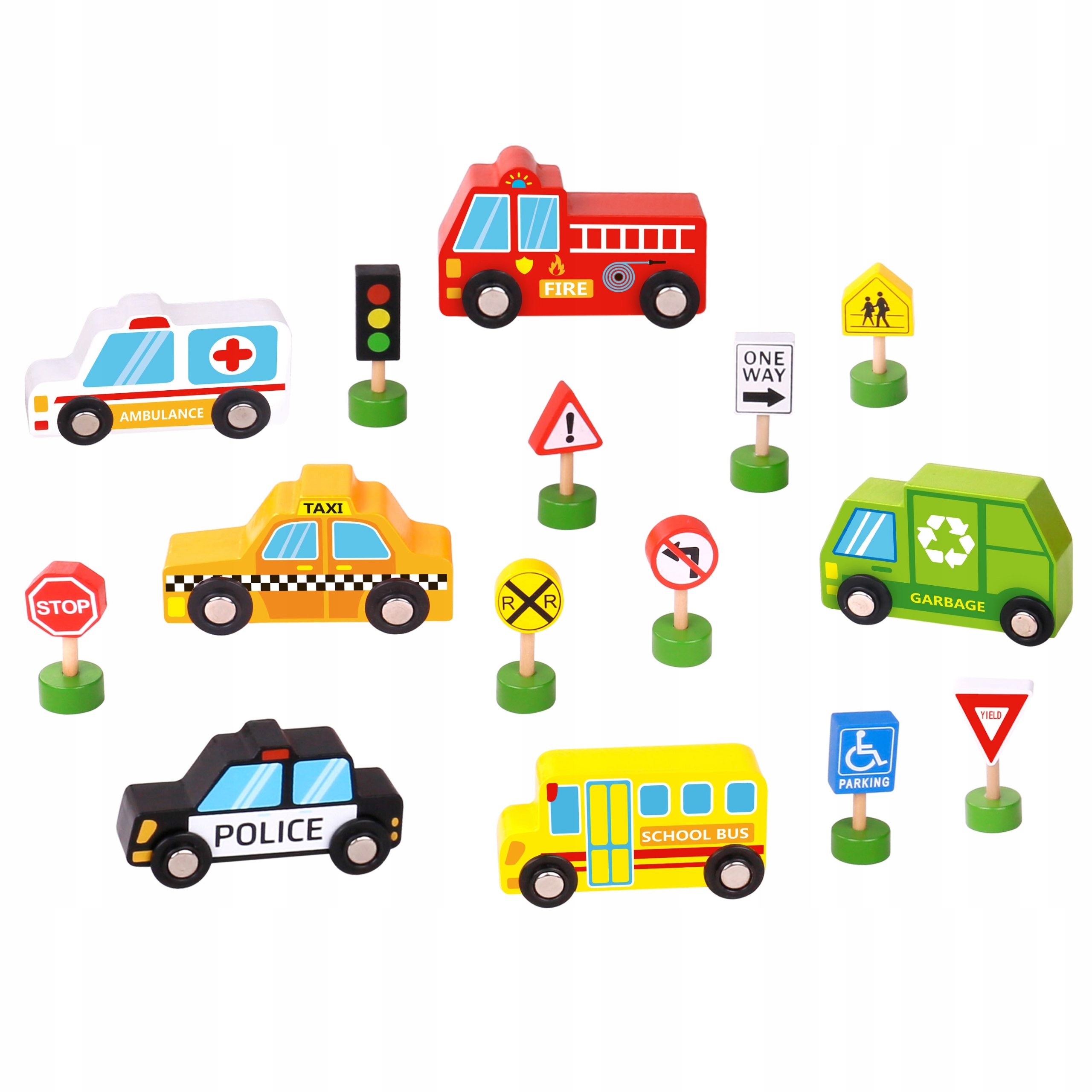 дерев'яний набір від woopie Green - відмінний навчальний інструмент, який завдяки Play вводить дитину у світ правил дорожнього руху. включені 6 барвисті транспортні засоби та 9 дорожніх знаків, які допомагають малюкові вивчити основні правила безпеки на дорозі. ціле виготовлено з міцної деревини і безпечних, нетоксичних фарб