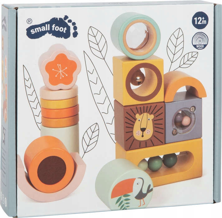 Набір складається з 12 дерев'яних b> елементів. Блоки мають різні наповнювачі, які сприяють сенсорному розвитку.