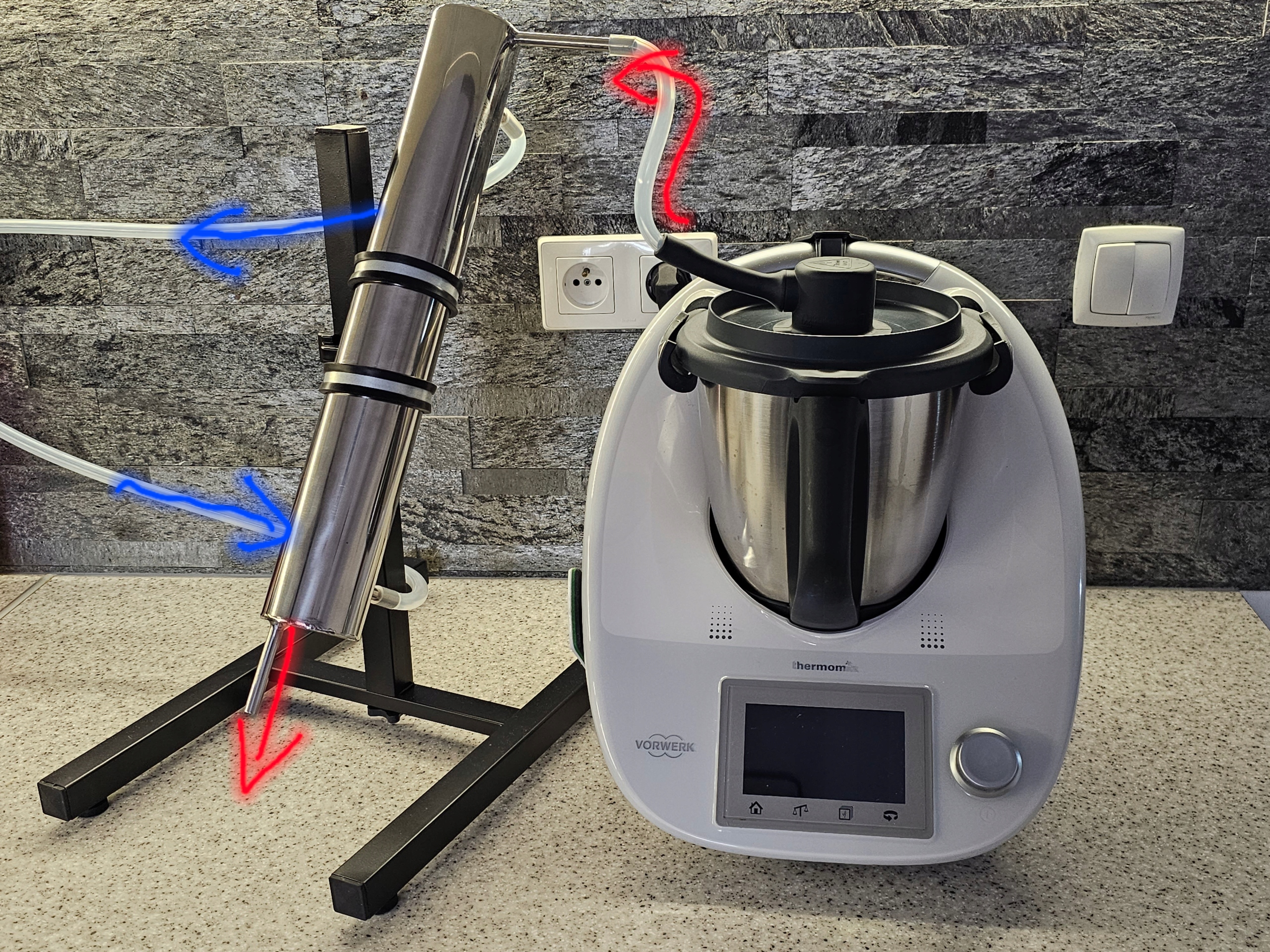Форма ідеально прилягає до стінок кришки, тому пара виходить не з боків, а лише з вихідного сопла, до якого ми під’єднуємо шланг, що з’єднує Thermomix із охолоджувачем дистилятора.