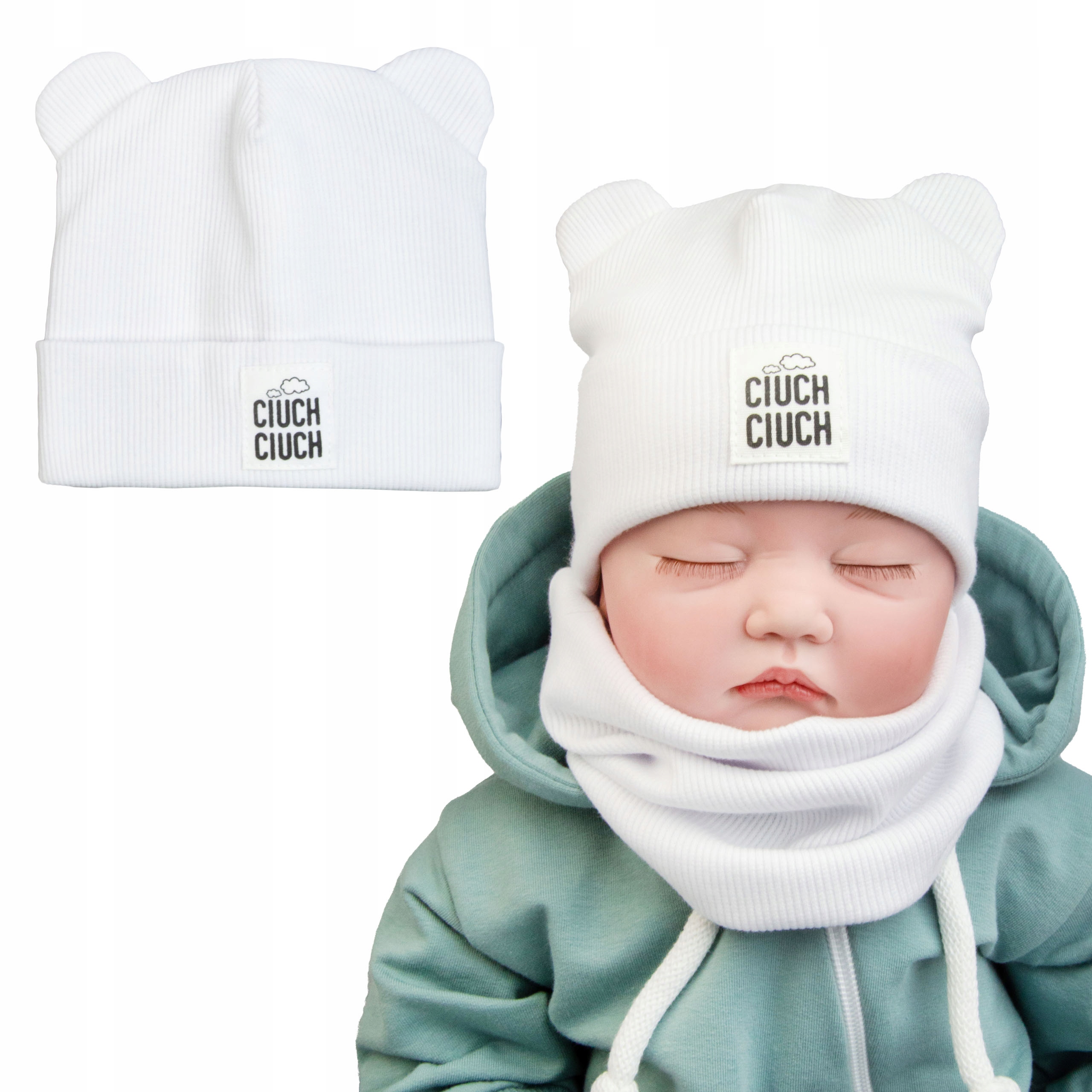 Абсолютний хіт цього сезону - біла шапка з подвійної рубчик, з вушками і латкою.