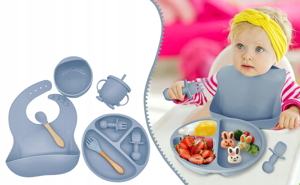 - Наша тарілка для немовлят містить усе, що вам потрібно, включаючи 1 регульовану силіконову, 1 тарілку для дитини з присосною чашкою, 1 чашкою для дитини з присоскою, 1 чашкою, 2 столовими місцями та 2 вилками.