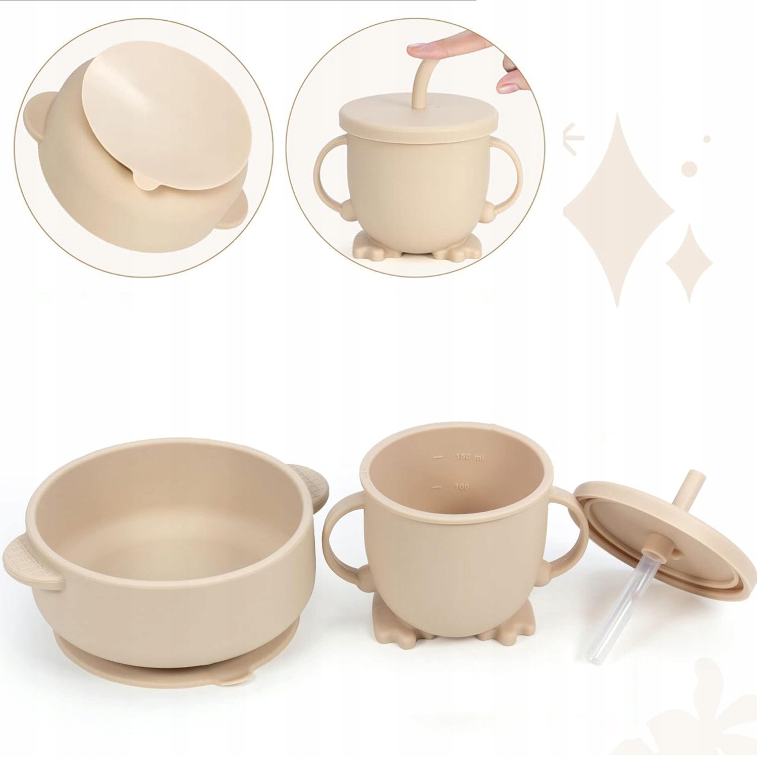 - 🍴 - 【Intelligent Division】:Дитяча тарілка має чотири незалежні присоски для запобігання ковзанню та перекиданню. Він розділений на три секції для подачі різних страв і оснащений кришкою для зручного зберігання готового дитячого харчування та зберігання залишків. Силіконова чашка для пиття була спеціально розроблена для немовлят зі знімною кришкою для запобігання протіканню, практичною соломинкою та ручками ергономічної форми.