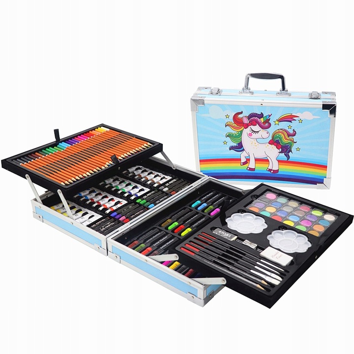 Розвивайте уяву та творчі здібності вашої дитини за допомогою художнього набору. Чарівна валіза містить все необхідне для розваг: кольорові олівці, фломастери, пастель, фарби та інші предмети, корисні для художньої творчості: лінійка, ластик, пензлик тощо.