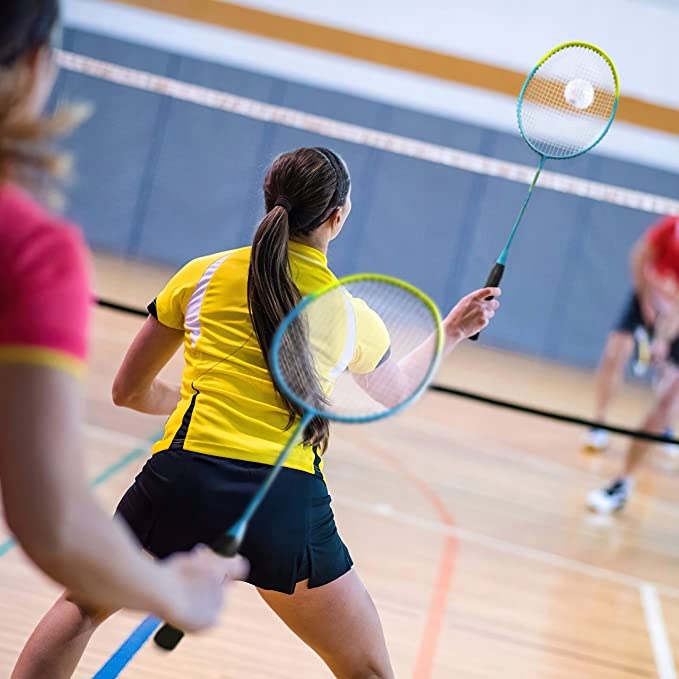 Ракетки для бадмінтону для 2 дорослих гравців, включаючи: 2 ракетки для бадмінтону, 2 нейлонові волани з пробковим дном, сумку з регульованим плечовим ременем, 2 попередньо встановлених чохли. Підходить для гри в приміщенні та на вулиці