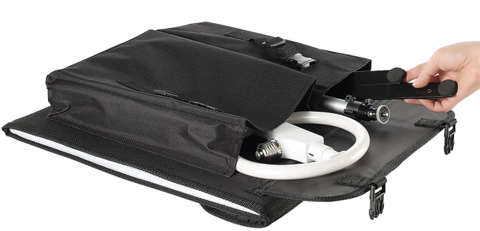 Увесь набір упакований у маленьку портативну валізу, яку можна розпакувати, зібравши готовий набір для професійної безтіньової фотографії за кілька хвилин.