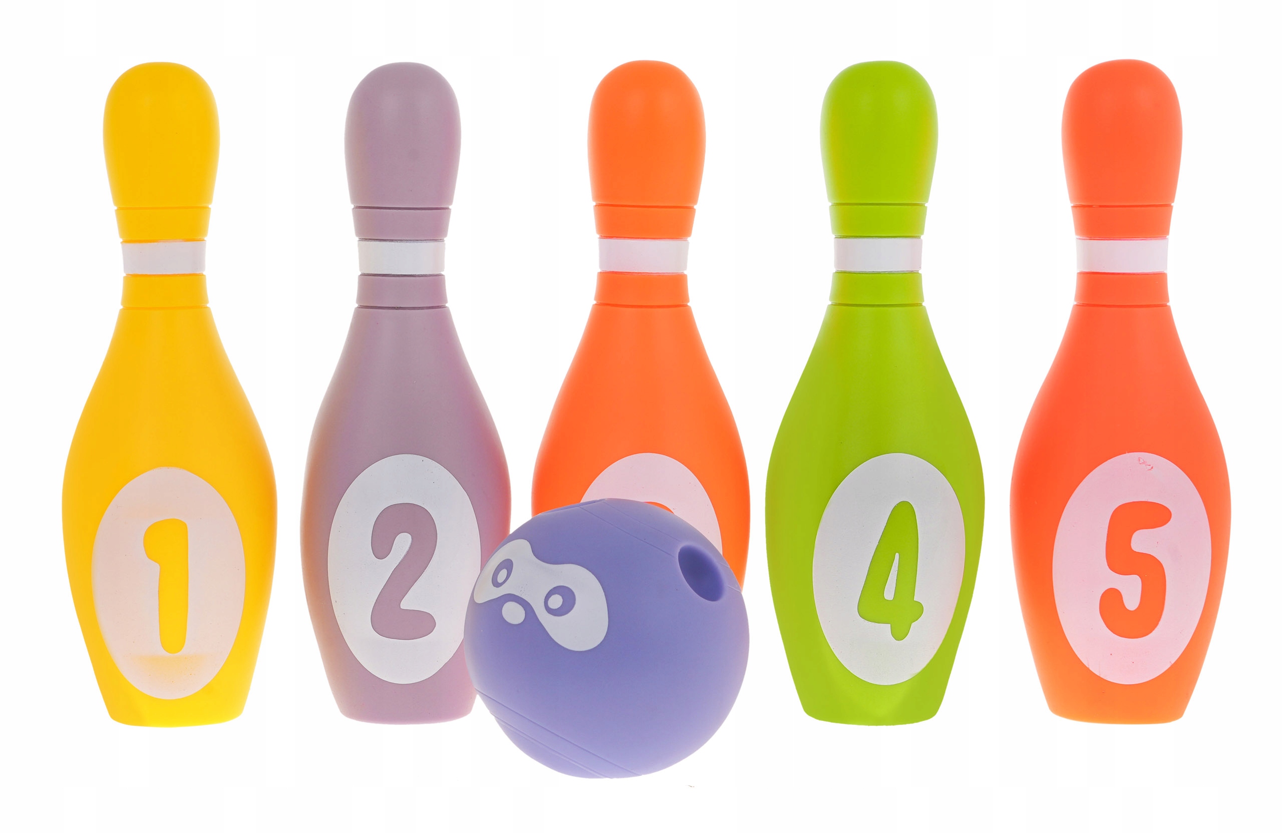 - Набір кольорових пінопластових кеглів, безпечних для немовлят віком від шести місяців. Кеглі виконані в красивих пастельних тонах. Кожна кегля має свій номер від 1 до 5. У набір входить пінопластовий м'яч зі смайликом. Кеглі та м'яч для боулінгу виготовлені з нетоксичного пінопласту, безпечного для малюка і водночас м'якого та легкого. І пилка, і кеглі не мають гострих країв або занадто дрібних елементів. При стисканні кожен елемент видає скрип.