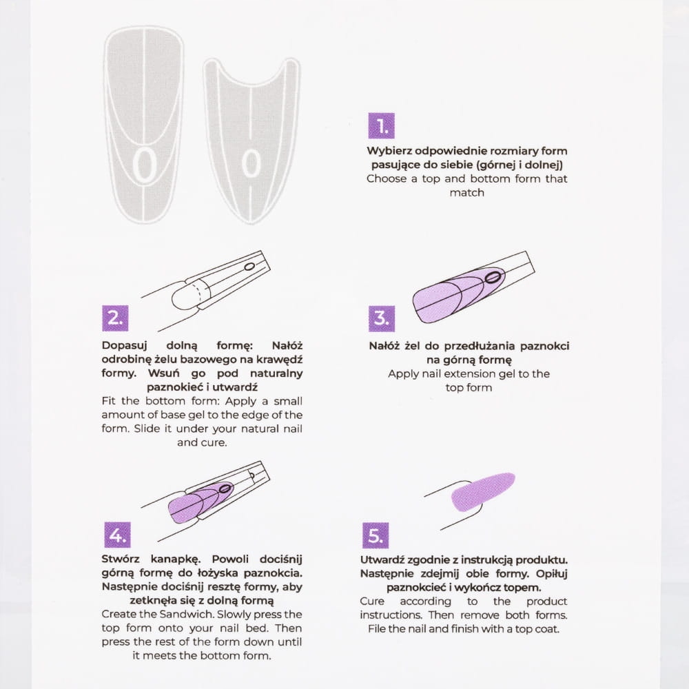 - Двоелементна система: Форма складається з нижньої та верхньої частини. Така структура гарантує повторюваність форми та гладкість поверхні з обох сторін нігтя.