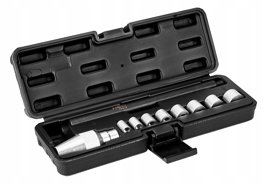 Набір для центрування дисків зчеплення – набір із 9 елементів NEO для центрування дисків зчеплення в більшості легкових автомобілів і деяких фургонів. Всі елементи оцинковані, що робить їх стійкими до корозії. У комплекті: направляючий вал, центруючий вал, 7 редукторних втулок ø 11, 12, 15, 17, 19, 20, 21, 25 мм. Набір упакований у валізу.