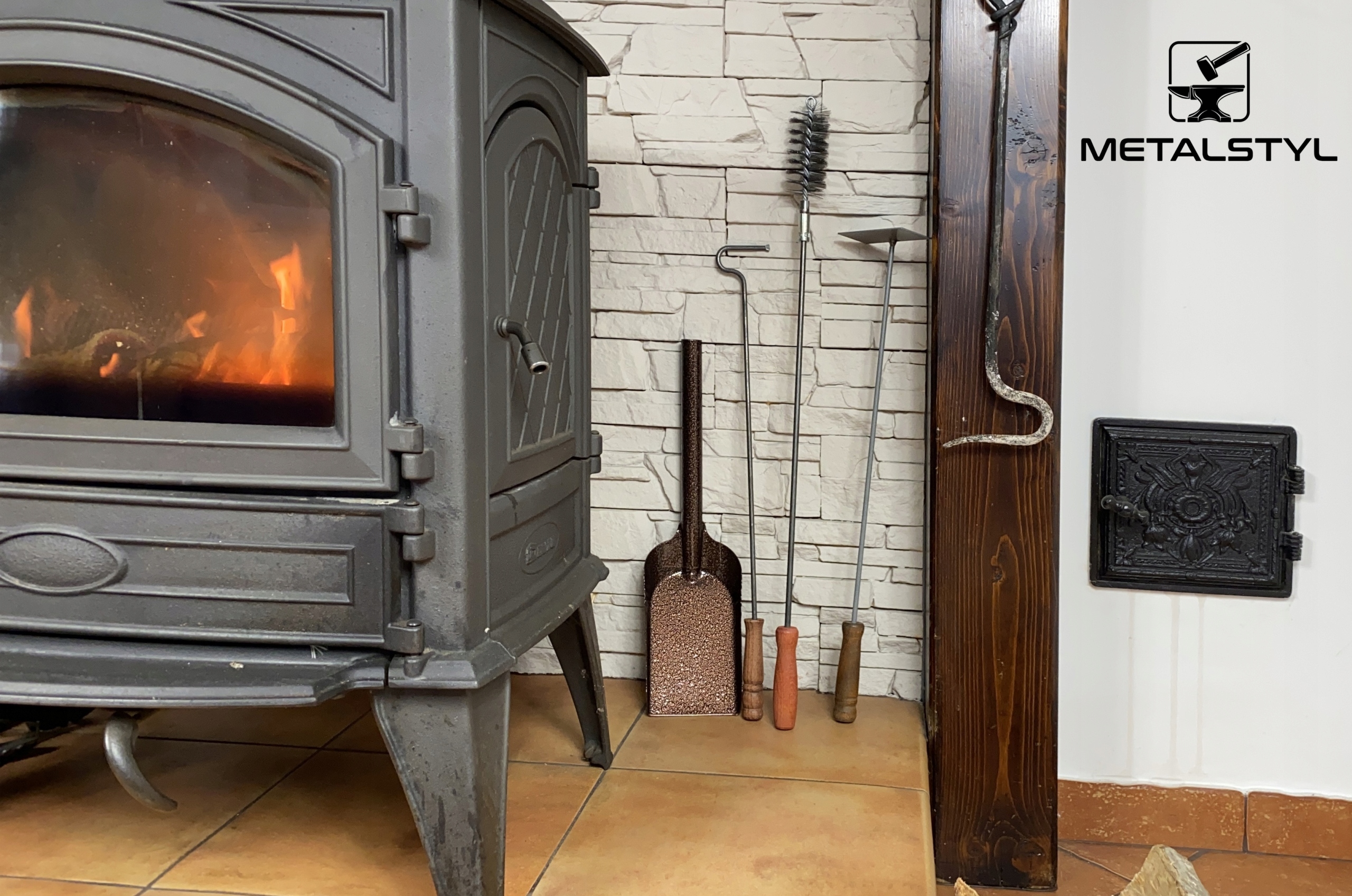 Набір необхідних інструментів для чищення камінів, печей і димоходів включає: скребок, кочергу, стрижень для чищення, щітку для печі, лопату та віник