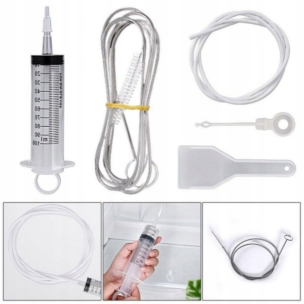 Набір складається з п'яти елементів, призначених для чищення дренажних труб, ідеальних для обслуговування. та усунення засмічень у дренажах холодильників. Він дозволяє швидко і легко позбутися неприємних запахів, твердого льоду і бруду, які можуть виникнути в результаті закупорки зливу. Призначений для очищення зливних труб не тільки в холодильниках, але і в умивальниках, мийках та інших подібних пристроях.