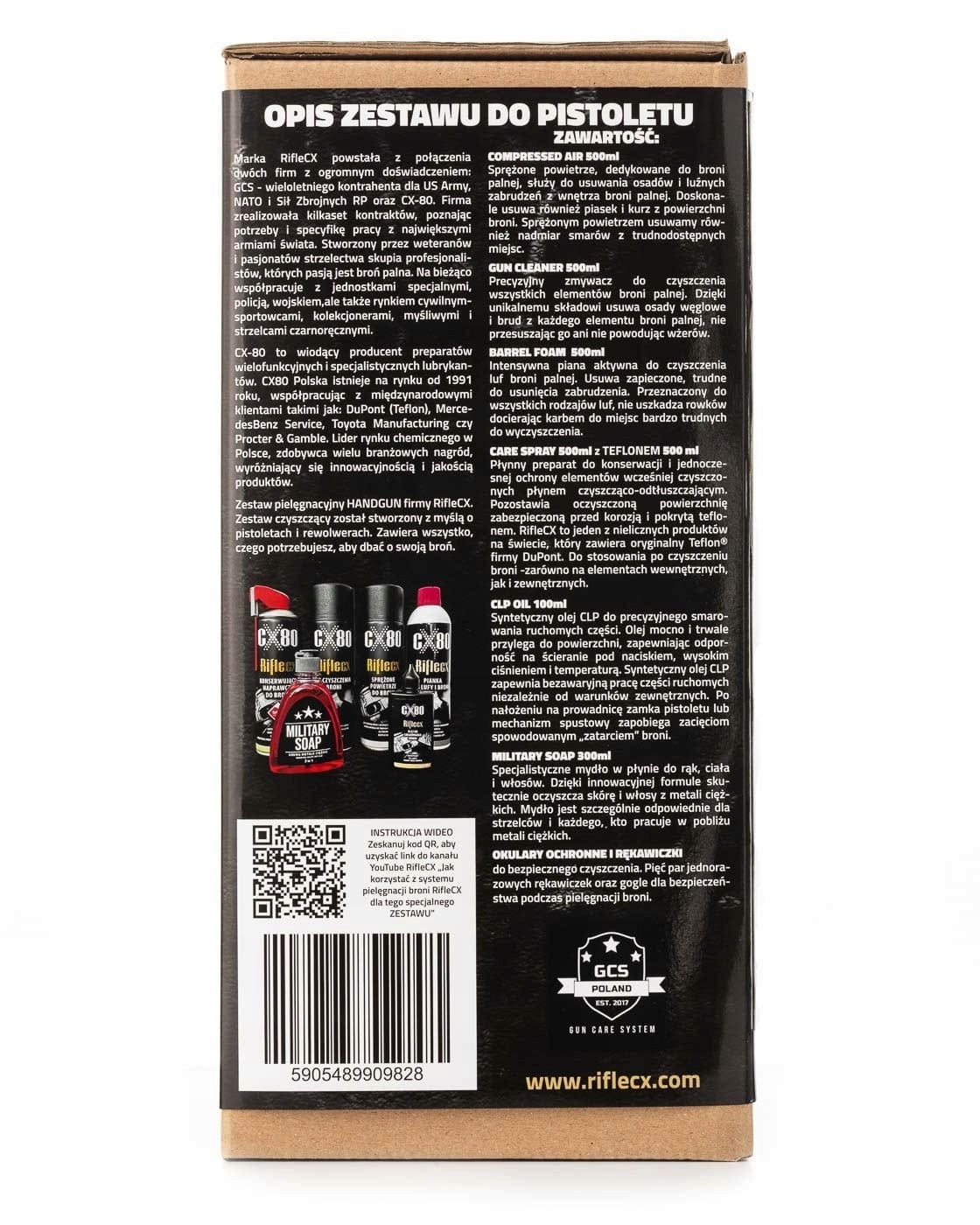 Купуючи набір пістолета Riflecx - Gun Care System, ви отримуєте все необхідне для належного догляду за своєю зброєю. На зворотному боці коробки ви знайдете опис підготовки, а збоку QR-код, який приведе вас до навчальних відео Riflecx на YouTube, де ми крок за кроком покажемо, як користуватися нашою системою.