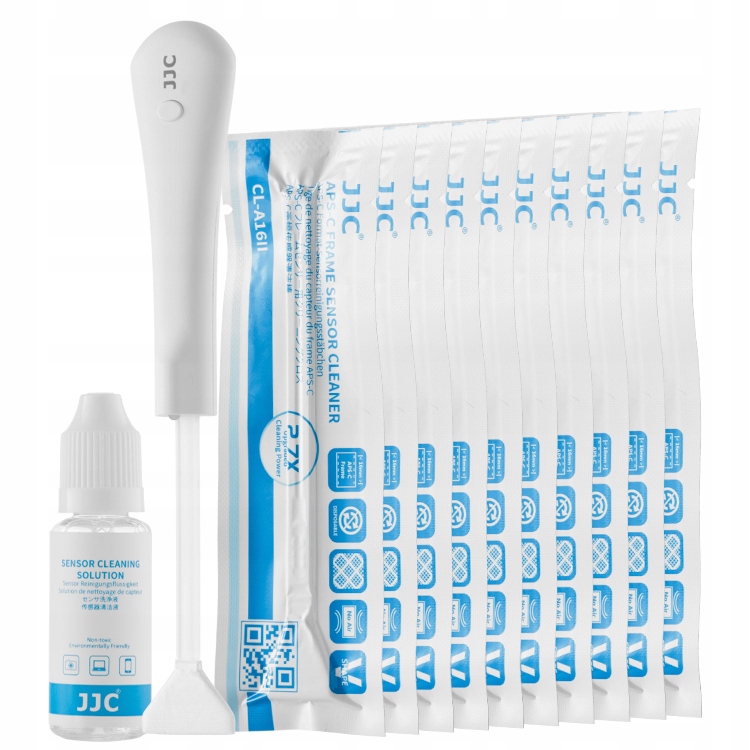 Набір JJC CL-FS10K2 для чищення повнокадрових матриць складається з набору з 10 шпателів, окремо упакованих у вакуумну упаковку, спеціального тримача для паличок із вбудованим світлодіодним підсвічуванням і рідини для очищення. Завдяки підсвічуванню легше чистити та бачити навіть найменші та делікатні забруднення.