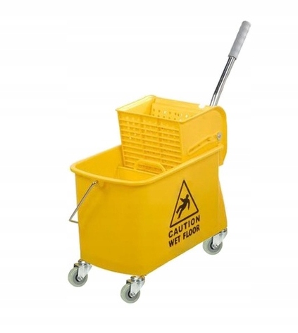 Візок KENTUCKY складається з двокамерного відра, виготовленого з високоякісного матеріалу ABS, що характеризується високою стійкістю до розтріскування. Він використовує щелепний прес, що полегшує процес віджимання. Цей прес працює з плоскими, нитковими швабрами та швабрами Kentucky, а його сталева ручка дозволяє безпечно керувати візком. Коляска оснащена колесами, які є міцними та стійкими та не дряпають землю під час руху. Все це забезпечує належний комфорт роботи.