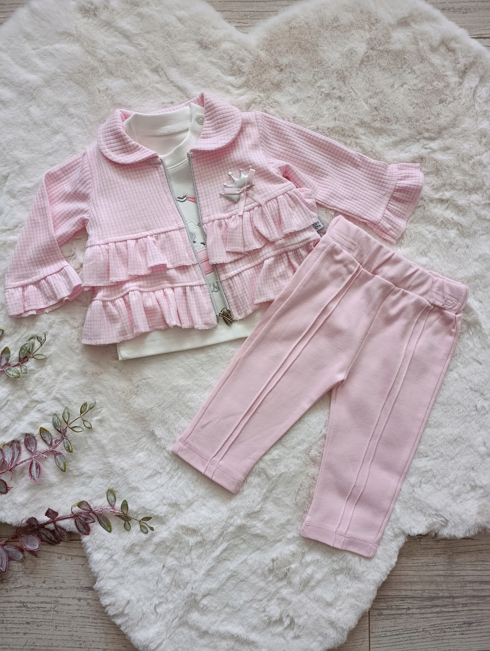 Толстовка, виготовлена з злегка смугастого матеріалу в горизонтальних смугах біло-рожевих,-ще один елемент набору, який привертає увагу своїми унікальними гончаками. Толстовка не тільки функціонує завдяки кріпленням кавоварки, але й витонченою завдяки надмірностям, комірам та пришиті сріблястому короні з рожевим луком. Весь набір створює гармонійне ціле, ідеально підходить для всіх випадків, забезпечуючи при цьому тепло та стиль наймолодшого.
