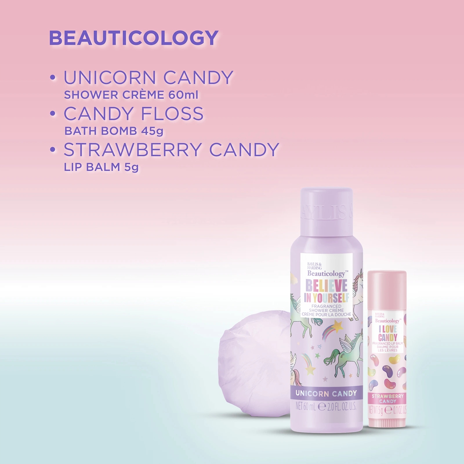 Колекція Beauticology — весела, грайлива та сповнена кольорів і ароматів, які порадують будь-якого любителя єдинорогів. Дизайн із голографічними деталями, пастельними кольорами та магічними мотивами доповнює солодкий аромат цукерок, який ідеально підходить для маленьких та великих шанувальників казкового світу.