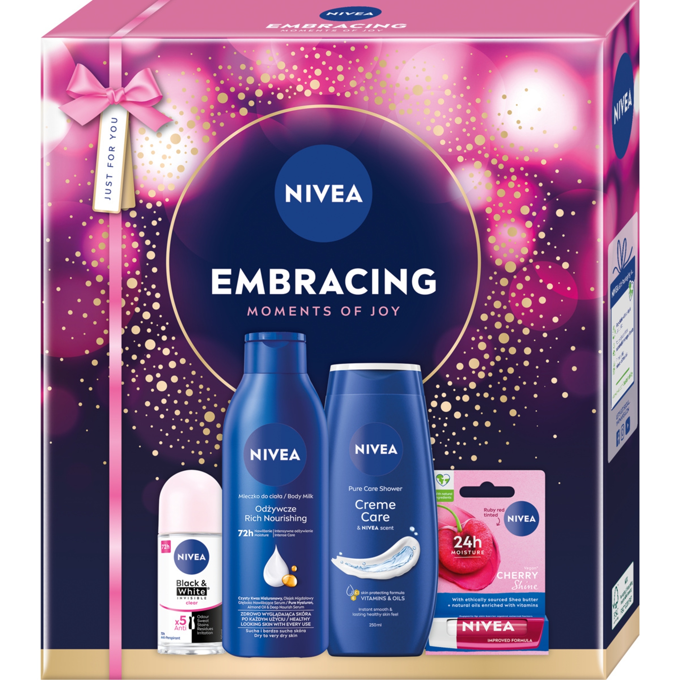 Шукаєте ідею подарунка на Різдво? Подаруйте своїй коханій набір догляду за тілом NIVEA Embracing! У наборі аж 4 засоби для комплексного догляду за тілом: гель для душу, антиперспірант, молочко для тіла та помада. Доглядають формули забезпечать шкірі винятковий захист і догляд. Це ідеальний новорічний набір косметики для жінок різного віку. Обирайте подарунок і турботу в одному – від NIVEA. Переносимість шкірою підтверджена дерматологічно.