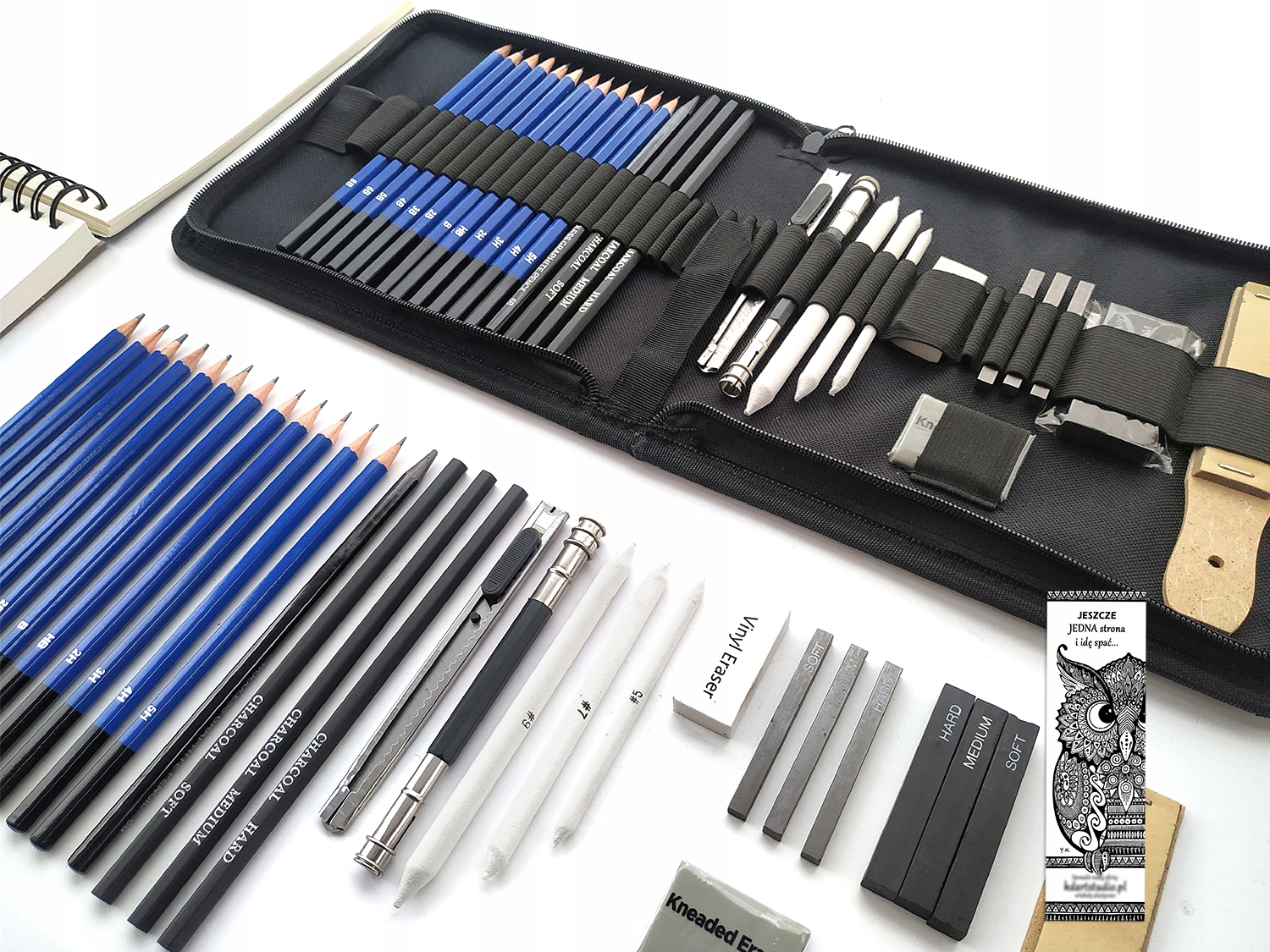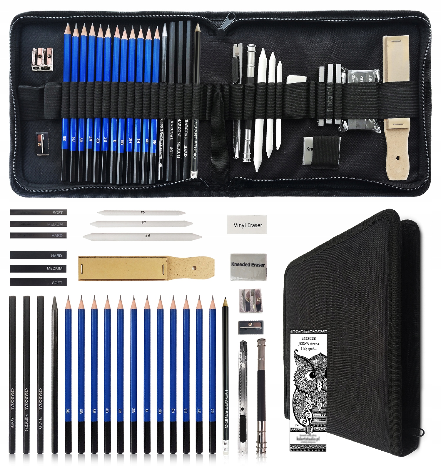 - 32 ELEMENTS - набір має дуже великий вибір елементів, призначених для креслення, малювання тощо. Ви можете вибрати олівці різної м’якості, шматочки вугілля, гумки та багато інших корисних інструментів для письма, які знадобляться під час роботи.