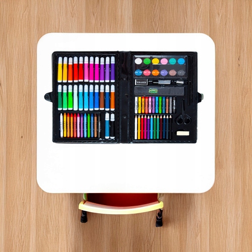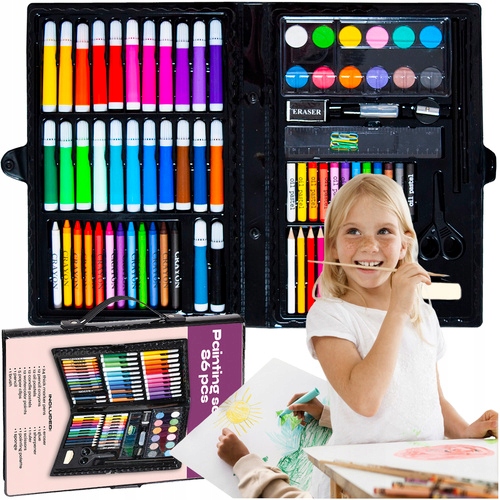 - 86 елементів - з великим вибором 12 олівців, 24 маркерів, 12 масляних пастелів, 12 пастелів свічок, 12 акварельних фарб, палітра живопису, пензля, губки, олівця, ножиць, темпів, ключа , Linei та барвисті кліпи Дитина легко створить найбільш фантазійні, творчі та оригінальні твори .