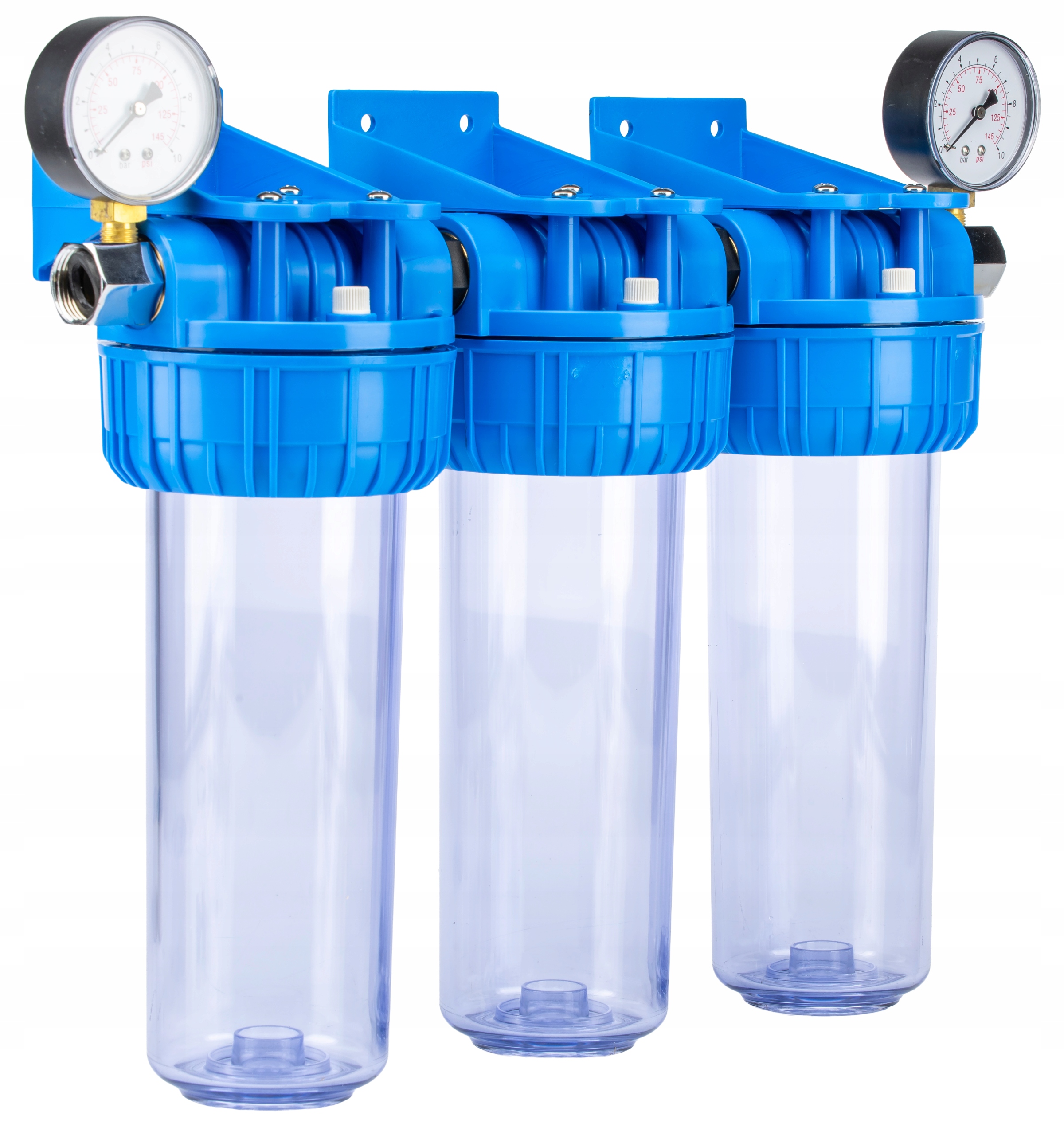 НАБІР ДЛЯ ФІЛЬТРАЦІЇ ВОДИ В ТРИ СТУПЕНІ З НАБОРОМ МАНОМЕТРІВ 3/4" 2-6 БАР, КОРПУС, МАНОМЕТР, МОНТАЖНА ПЛАСТИНА, КЛЮЧ, ТЕФЛОНОВА СТРІЧКА, З’ЄДНАННЯ, KLARWOD WF-SET3-34