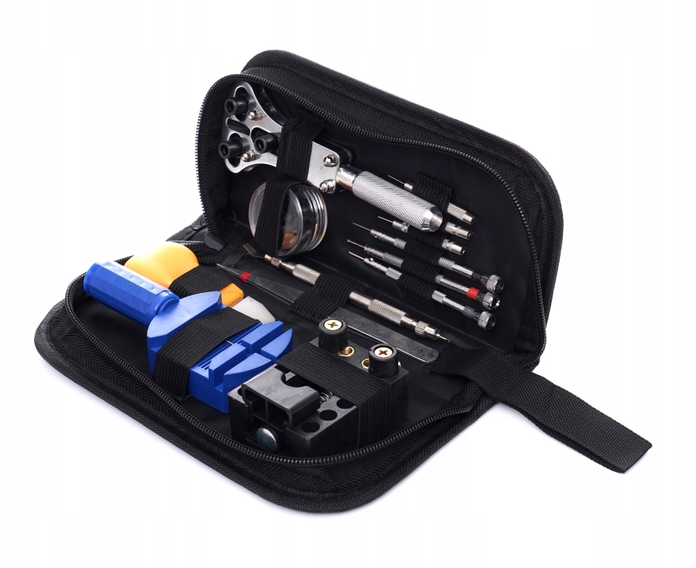 Годинникар інструменти зберігаються в тканинному чохлі на блискавці, що забезпечує зручність перенесення та безпечне зберігання інструментів.