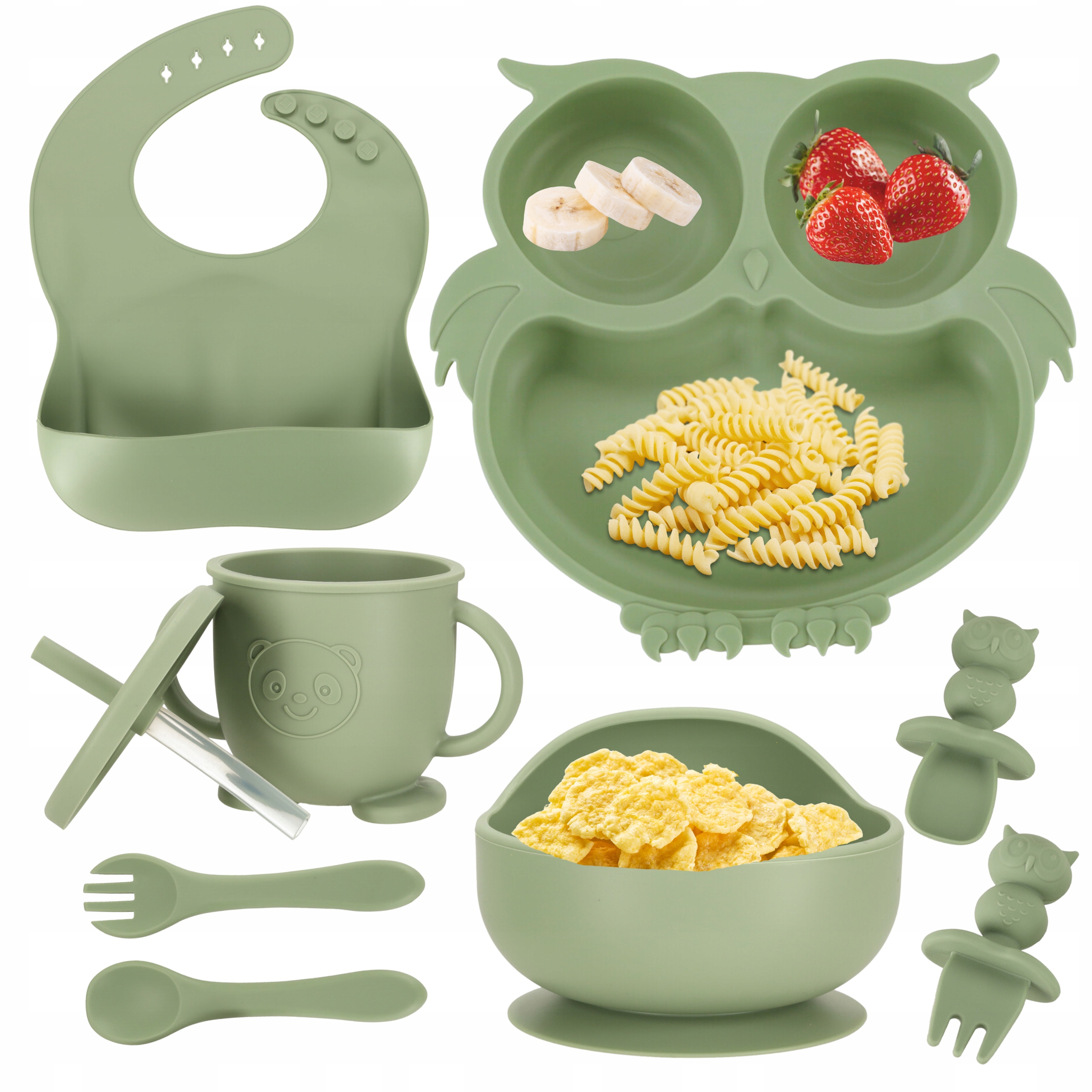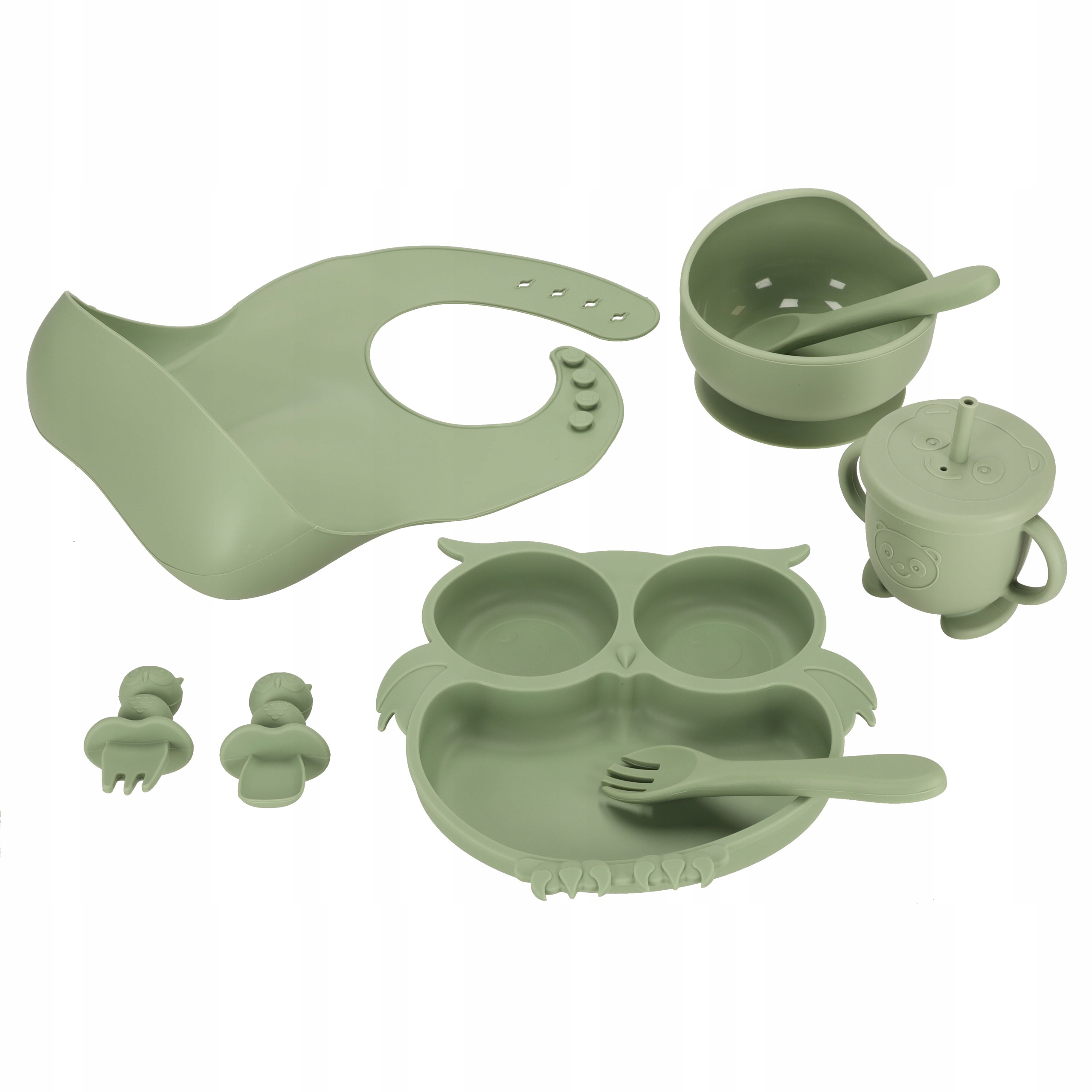 Набір силіконових судин - це функціональна допомога для незалежної їжі для навчання малюка. Він містить аж 8 елементів : тарілка у формі сов з відділеннями , глибока миска, чашка з соломою, з кишеню і два набори зручних столових приладів. Усі частини виготовлені з безпечної їжі силікону, який є міцним, м'яким і простим у чистоті.