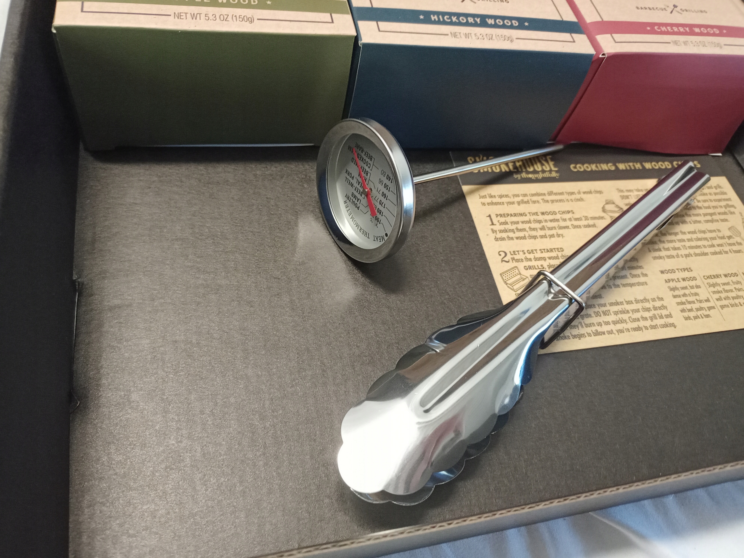 - НАБІР ДЛЯ ГРИЛЮ - дерев'яна стружка, контейнер для куріння з нержавіючої сталі, соус і паста для гриля, термометр, щипці та направляюча.