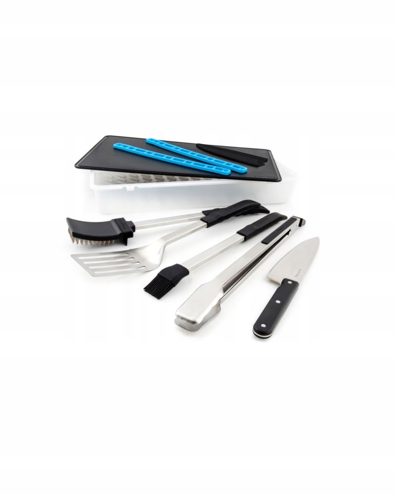 Тож у нас двосторонній обробна дошка та ніж, щоб підготувати інгредієнти, контейнер, який ми можемо використовувати лопатку та щипці для гриля, щоб маринувати м’ясо, і силіконову щітку, щоб натирати м’ясо маринадом та олією.