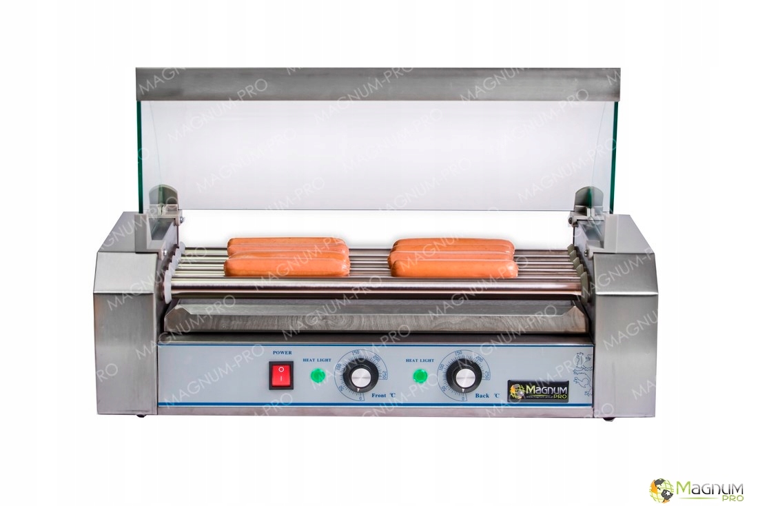 надзвичайно проста та інтуїтивна робота за допомогою кнопки вимкнення/вимкнення та два термостати з рідиною з регулюванням температури до 250 ° C на двох зонах нагріву (три передні та два задні ролики). Завдяки двом зонам ми можемо нагріти нові - заморожені франкфертери при одній при більш високій температурі і лише підтримувати їх температуру з іншого. Керуючі лампи інформують нас про опалення та запуск машини.